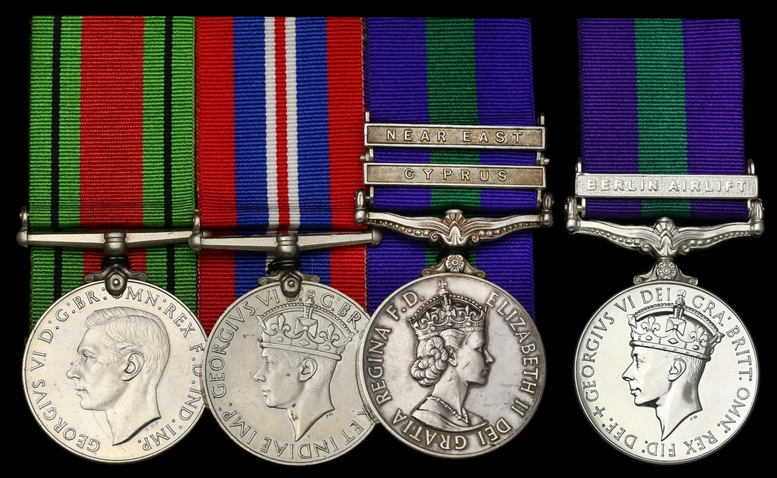 Defence and War Medals 1939-45; General Service 1918-62, 2 clasps, Cyprus, Near East (Flt. Lt. P. Markham, R.A.F.); General Service 1918-62, 1 clasp, Berlin Airlift (Nav. 3 P. Markham (3002984) R.A.F.), in its box of issue, together with a post-war textile Goldfish Club badge and a commemorative Berlin Airlift cigarette case, in gilt metal and enamel, the lid depicting a Dakota in flight over a map of Germany, good very fine and better (6)