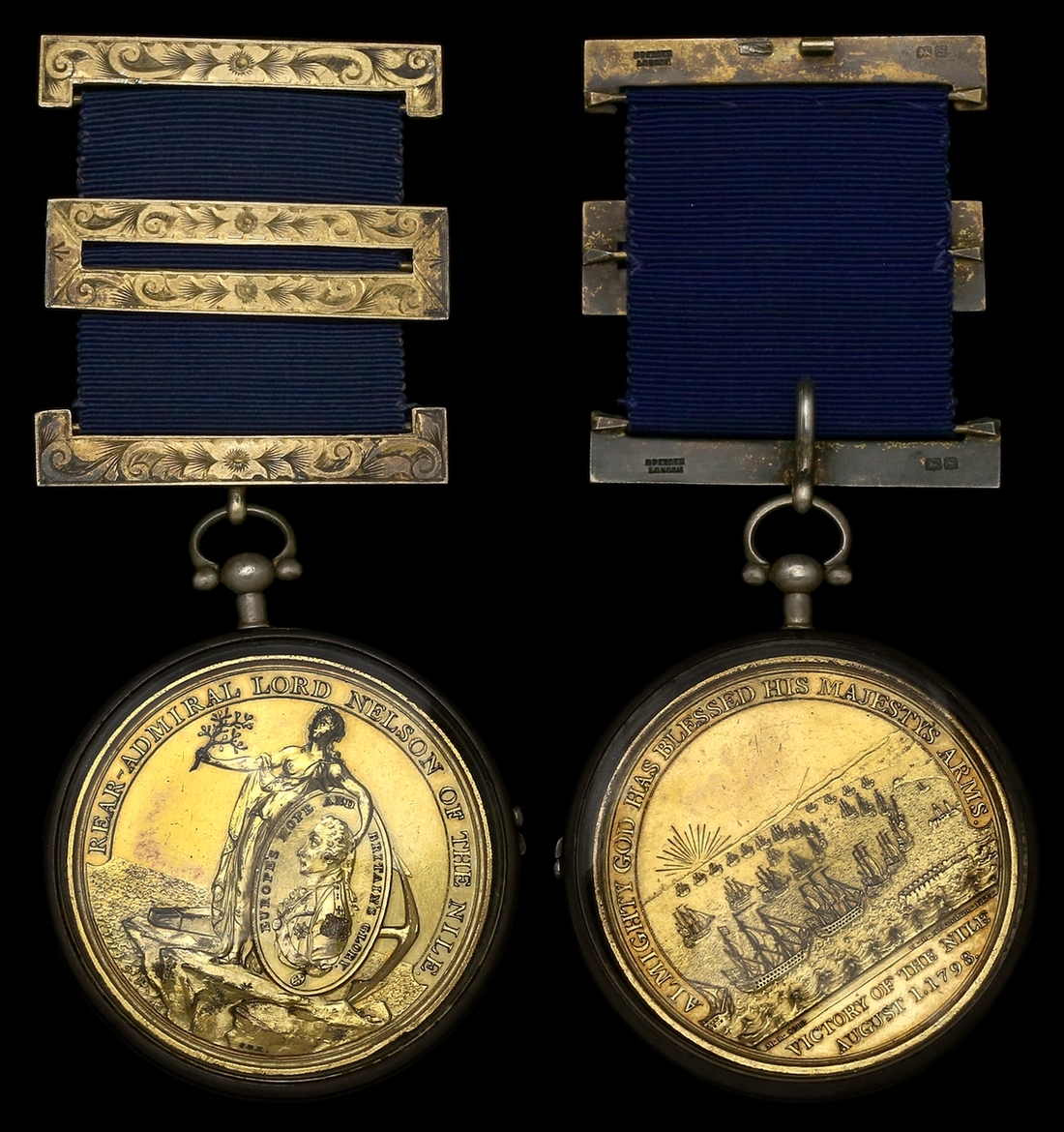 (x) Alexander Davison's Medal for The Nile 1798, bronze-gilt, contained within a contemporary hinged silver-coloured case with glazed lunettes and integral ring suspension, suspended from a riband with silver-gilt buckles, one minor edge knock, light scratches to obverse and reverse fields, reverse lunette loose, about extremely fine and a most attractive example