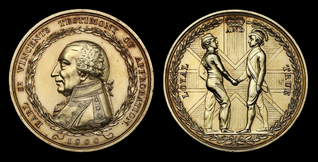 This medal was awarded by Admiral Sir John Jervis, upon relinquishing his command of the Channel Fleet, to the crew of his flagship (the 110-gun H.M.S. Ville de Paris) who remained loyal to him during the infamous mutiny at the Nore. The medal is not recorded as having been produced and distributed in silver-gilt, though numerous examples have since appeared.