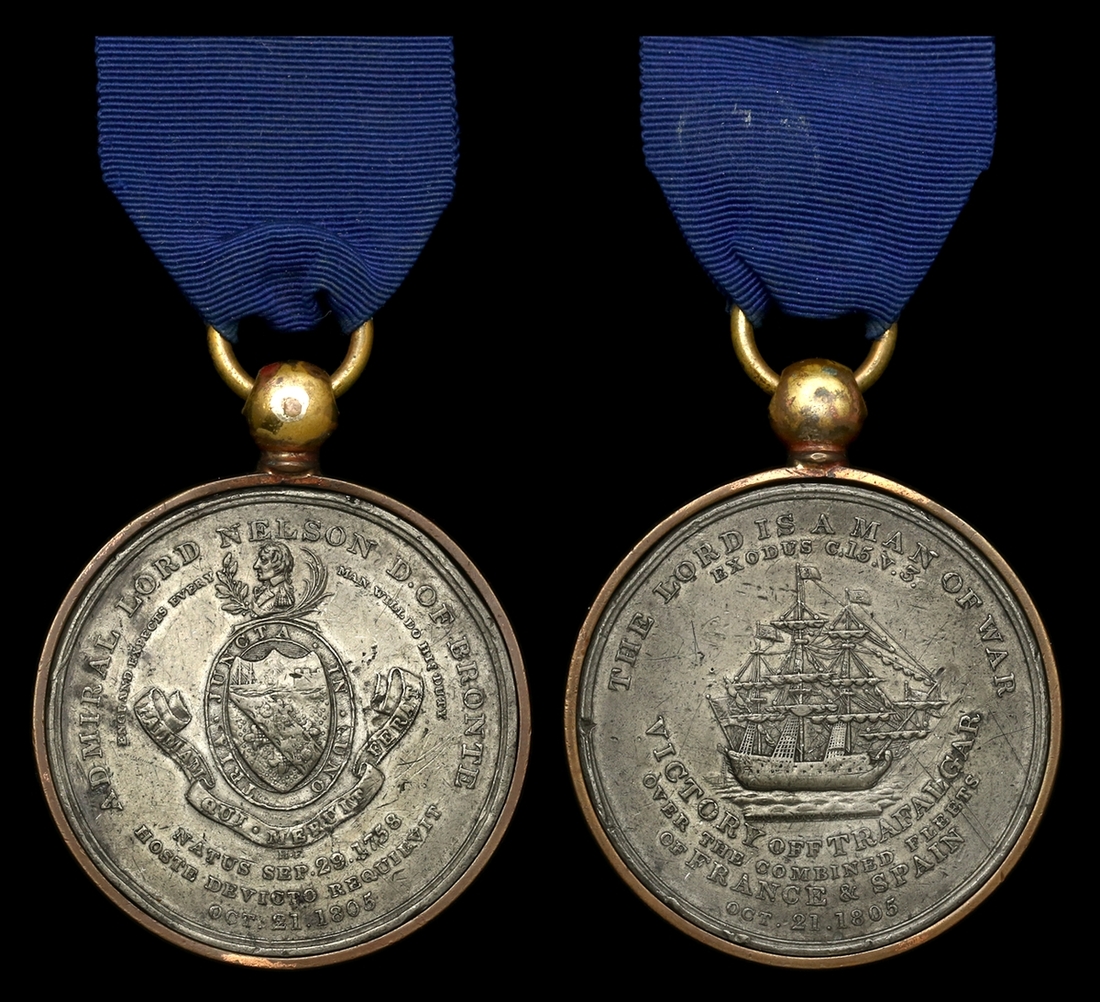 (x) Alexander Davison's Medal for Trafalgar 1805, pewter with copper ring and integral ball-and-ring suspension, highlights polished and scratches to obverse and reverse fields, good fine and better