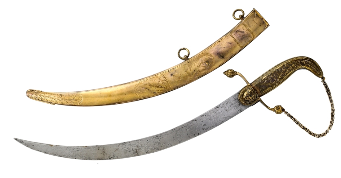 (x) A Royal Navy Midshipman's Dirk, of late 18th or early 19th Century manufacture, featuring a sharply-curved blade, this engraved with foliate decoration and the Spanish Coat of Arms, profusely decorated gilt-brass hilt with depictions of Medusa on the langets, gilt-brass scabbard, dual suspension rings, with foliate decoration and engraved eagle and snake, by Richd. Blachford & Co., 67 Lombard St., London, traces of gilt remaining to hilt and scabbard, total length 470mm, an attractive and intriguing example, good very fine