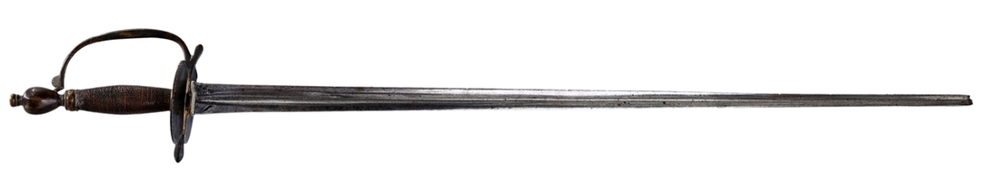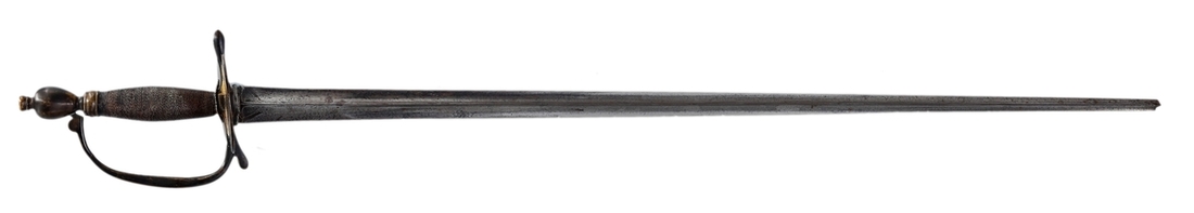 European smallsword, of late-18th Century manufacture, with a triangular steel blade and brass 'shell'-type guard, the grip bound in brass or copper wire, the underside of the guard attractively and contemporarily engraved: Thos. Southey Taken April 21st 1798, the tip of the blade with a very old break, traces of gilt to guard, generally good fine