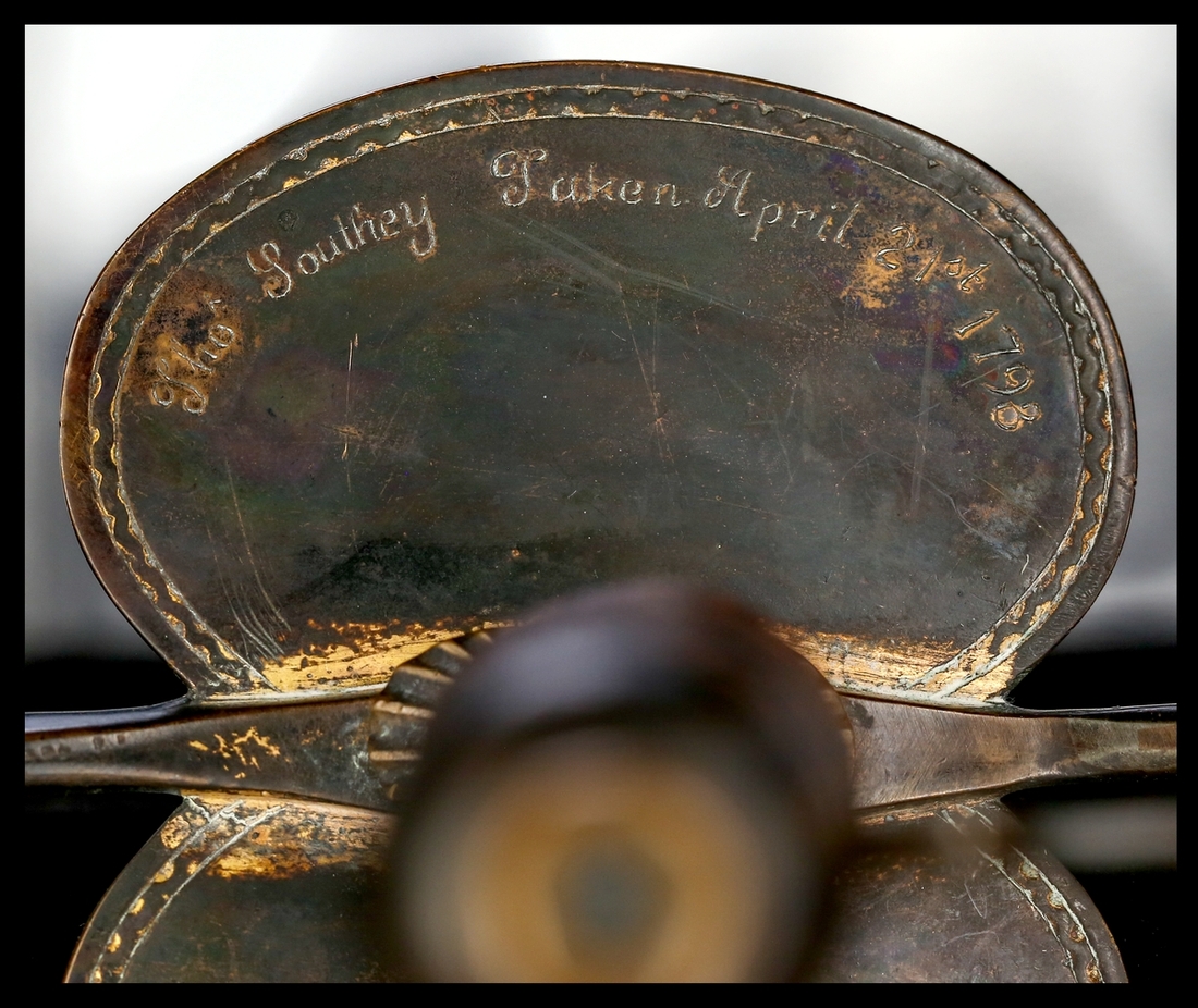 Realising he could not win the gunnery duel, Lheritier ordered his men to board Mars - but first one, then a second, boarding attempt were repulsed with heavy losses and the French captain was himself wounded twice whilst leading the assaults. Upon the defeat of this second attempt, taking into account his casualties and seeing further British ships coming up to support Mars, Lheritier surrendered at 10.30 p.m. and handed his sword to Lieutenant Butterfield - perhaps it was at this time that Southey came into possession of a similar sword from a more junior French officer. Casualties were horrific, even by the standards of the day: Mars had lost 22 killed (including Captain Hood), 60 wounded and eight missing, and Hercule counted at least 290 killed and wounded out of a crew of 680. In the aftermath of the action Southey was promoted Lieutenant, and this sword was likely a memento of a hard-fought action he would never forget.