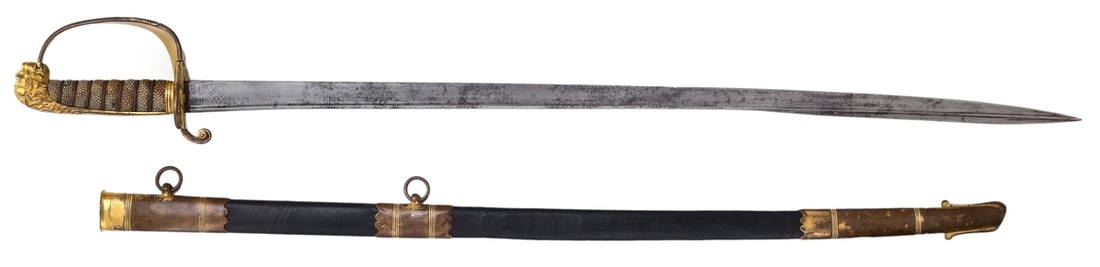 1827-Pattern Naval Officer's sword, by Dudley, Grand Parade, Portsmouth, the blade very lightly curved with a pipe-back and quill point decorated with Trophies of Arms, a Fouled Anchor and Crown, and bearing the legend etched to one side: 'Made From Iron of the Royal George, sunk 1782, Recovered 1840', gilded brass guard bearing a Crown and Fouled Anchor, lion's head pommel and ray-skin grip bound in copper wire, leather and gilded-brass scabbard, by Dudley, Grand Parade, Portsmouth, with dual rings for wear, overall length 842mm, much loss of gilding to scabbard fittings, otherwise good very fine