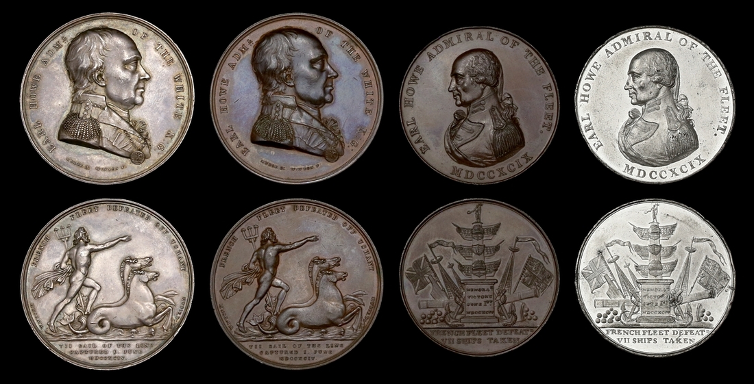 (x) Admiral Earl Howe, Naval Victory of the First of June 1794, obverse bust of Admiral Earl Howe in profile facing right in Full Dress uniform with legend 'Earl Howe Adml. of the White K.G.' surrounding, signed 'Mudie D:' and 'W. Wyon. F:' below, reverse Neptune and Hippocamps with legend 'French Fleet Defeated Off Ushant' surrounding and legend 'VII Sail Of The Line Captured 1. June MDCCXCIV.' in exergue below, Eimer 856, BHM 387, 41mm, silver (1), copper (1); Death of Earl Howe 1799, obverse bust of Admiral Earl Howe in profile facing left in Full Dress uniform with legend 'Earl Howe Admiral of the Fleet. MDCCXCIX' surrounding, reverse a triumphal column and trophy of arms and legend 'French Fleet Defeatd VII Ships Taken' in exergue below, Eimer 909, BHM 468, 38mm, copper (1), white metal (1), generally very fine and better (4)
