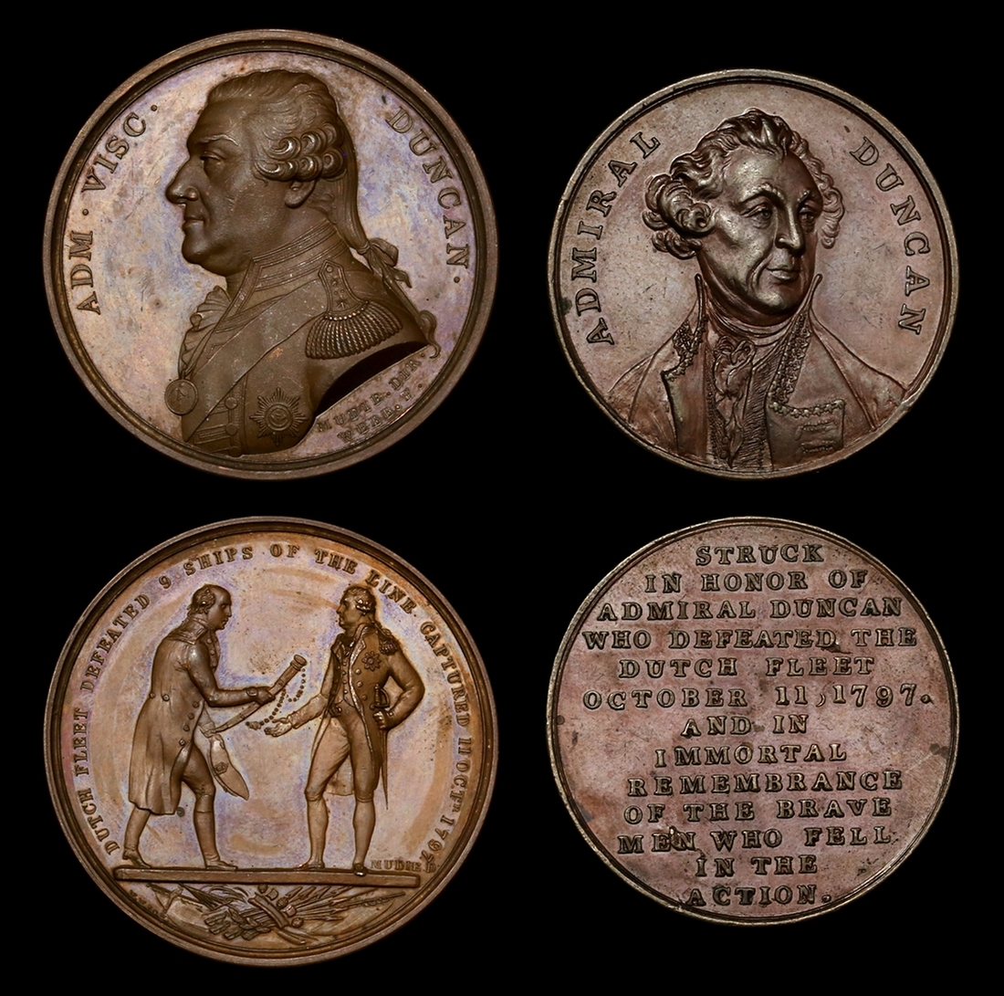 (x) Battle of Camperdown 1797, obverse Admiral Duncan facing left in profile wearing Full Dress uniform with legend 'Adm. Visc. Duncan' above and signed 'Mudie. Dir.' and 'Webb. F.' below, reverse Admiral Duncan receiving the surrender of Admiral de Winter and his sword with legend 'Dutch Fleet Defeated 9 Ships Of The Line Captured 11 Octr 1797' above and signed 'Mudie. D' below, Eimer 886, BHM 432, 41mm, copper; obverse Admiral Duncan facing quarter right in uniform with legend 'Admiral Duncan' above, reverse bearing text 'Struck In Honor Of Admiral Duncan Who Defeated The Dutch Fleet October 11, 1797. And In Immortal Remembrance Of The Brave Men Who Fell In The Action.', BHM 429, copper, 37mm, first good very fine with hints of original lustre, second very fine (2)
