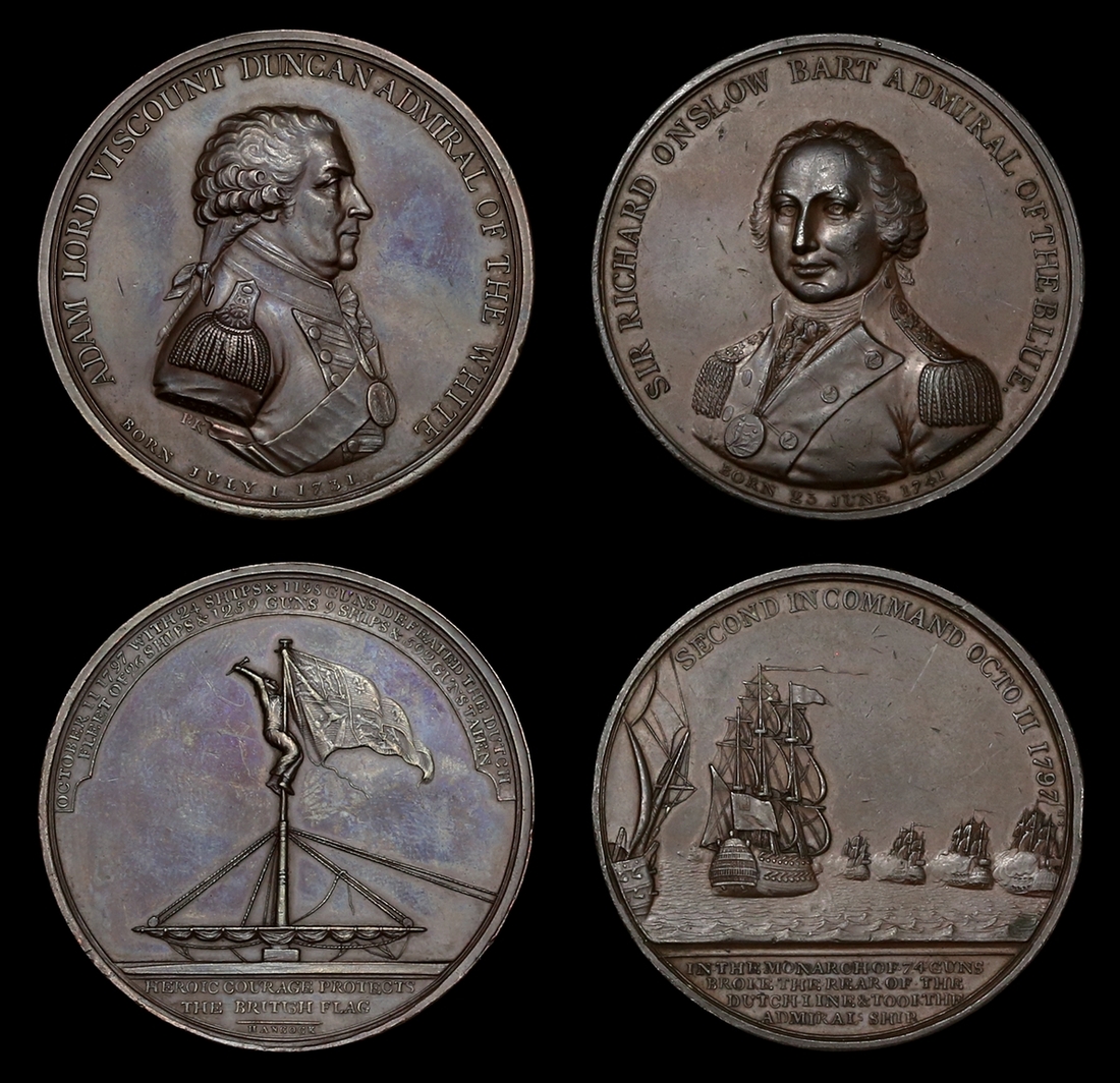 (x) Battle of Camperdown 1797, obverse bust of Admiral Duncan facing right in profile wearing Full Dress uniform with legend 'Adam Lord Viscount Duncan, Admiral of the White, Born July 1 1731' surrounding, reverse a British sailor affixing the Royal Standard to a topmast with legend 'Heroic Courage Protects The British Flag' in exergue below, Eimer 884, BHM 426, 49mm, copper; obverse bust of Admiral Sir Richard Onslow facing half-left in uniform with Naval Gold Medal with legend 'Sir Richard Onslow Bart, Admiral of the Blue, Born 23 June 1741' surrounding, reverse a depiction of the Battle of Camperdown with legend 'Second In Command Octo 11 1797' surrounding and legend 'In The Monarch Of 74 Guns Broke The Rear Of The Dutch Line & Took The Admirals Ship' in exergue below, Eimer 885, BHM 427, 48mm, copper, good lustre to first, scratches to second, about very fine and better (2)