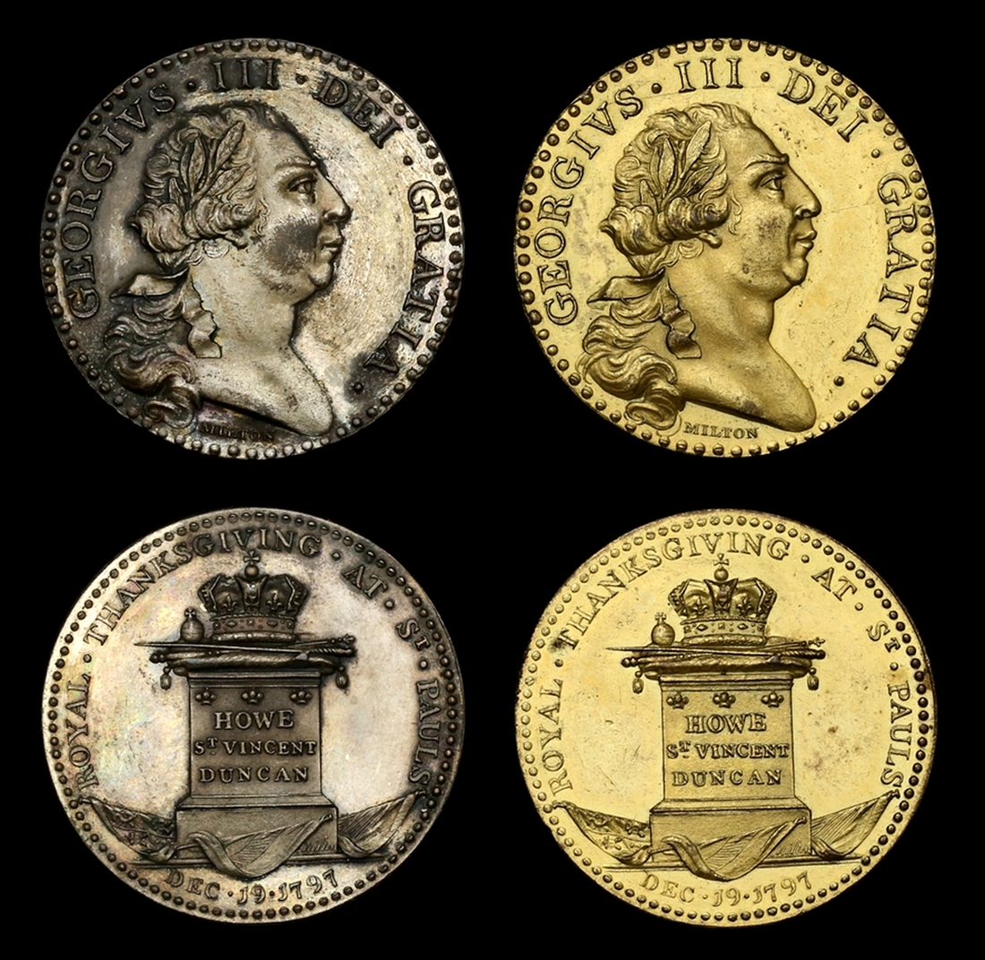 (x) Victories Celebrated 1797, Royal Thanksgiving at St. Paul's, obverse George III facing right with legend 'Georgius. III. Dei. Gratia.' above and signed 'Milton' below bust, reverse a monumental pillar bearing the names Howe, St. Vincent, Duncan, with three fleur-de-lys above and topped with Crown, Sceptre and Sword of State with legend 'Royal. Thanksgiving. At. St. Pauls' above and 'Dec. 19. 1797' below, BHM 439, 33mm, silvered copper (1), gilded copper (1), good very fine (2)