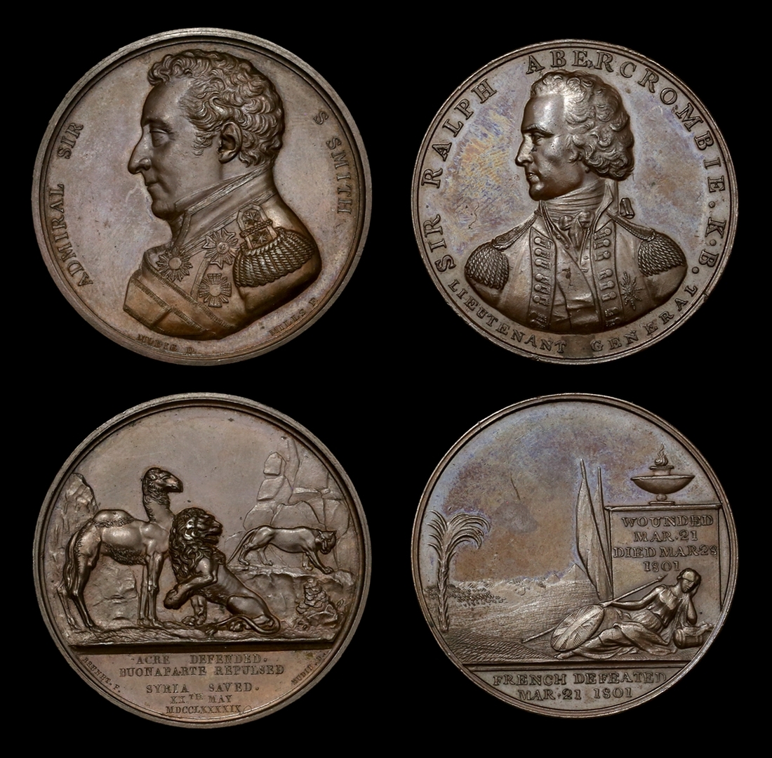 (x) Siege of Acre 1799, obverse Admiral Sir Sydney Smith facing left in profile, in Full Dress uniform with Orders prominently displayed, with legend 'Admiral Sir S. Smith' and signed 'Mudie D.' and 'Mills F.' below, reverse a (British) lion defending an (Egyptian) camel from a (French) tiger in a rocky mountain pass with legend 'Acre Defended. Buonaparte Repulsed Syria Saved. XXth May MDCCLXXXXIX' below in exergue and signed 'Mudie D.' and 'Brenet. F.', Eimer 906, BHM 476, 41mm, copper; Death of Sir Ralph Abercrombie 1801, obverse General Sir Ralph Abercrombie facing left in profile, in Full Dress uniform, with legend 'Sir Ralph Abercrombie. K.B. Lieutenant General' surrounding, reverse Britannia lying mournfully in front of a tomb bearing the legend 'Wounded Mar. 21 Died Mar. 28 1801', with pyramids, palm tree and battle in the distance and the legend 'French Defeated Mar. 21 1801' in exergue, Eimer 930, BHM 506, 40mm, copper, both generally very fine (2)