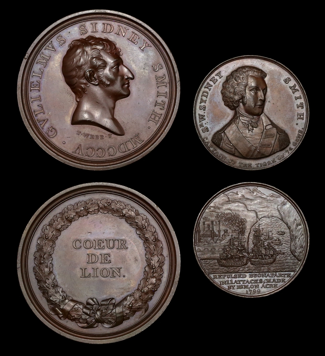 (x) Siege of Acre 1799, obverse bust of Captain Sir Sydney Smith facing quarter-right in uniform with legend 'Sr. W. Sydney Smith, Captain of the Tigre of 74 guns', reverse scene of Acre with legend 'Repulsed Buonaparte in 11 Attacks, Made By Him, On Acre 1799' below in exergue, Eimer 907, BHM 474, 38mm, copper; Sydney Smith, Promotion to Flag-Rank 1805, obverse bust of Sir Sidney Smith facing right in profile with legend 'Gulielmus Sidney Smith. MDCCCV.' surrounding and signed 'T. Webb. F' below, reverse a wreath of oak leaves with legend 'Coeur De Lion.' at centre, Eimer 971, BHM 573, 53mm, copper, generally good very fine (2)