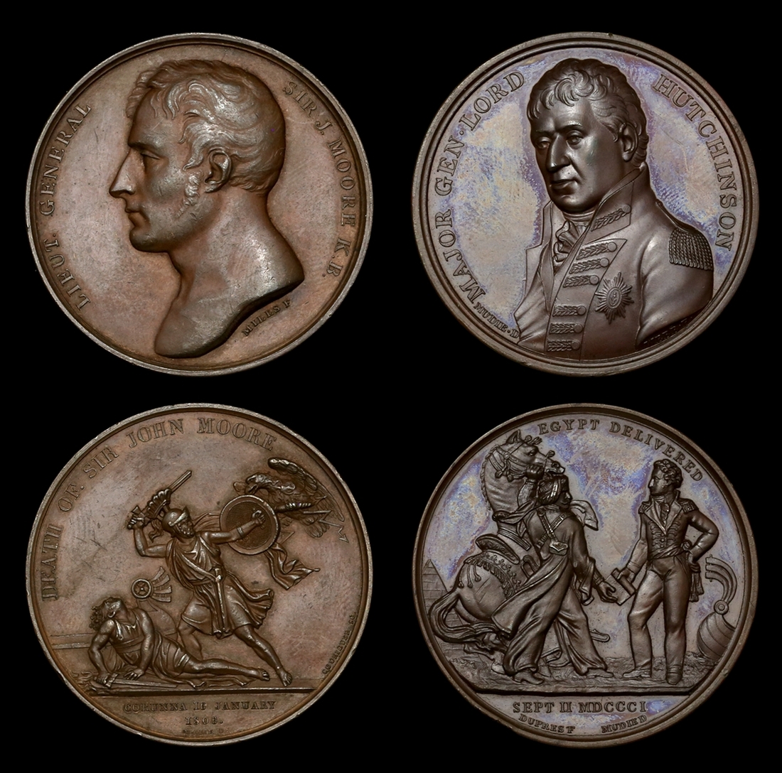 (x) Egypt Delivered 1801, obverse General Hutchinson facing half-left in Full-Dress uniform prominently displaying the Star of the Order of the Bath with legend 'Major Gen. Lord Hutchinson' above and signed 'Mudie. D', reverse General Hutchinson standing before the Bey of Egypt and rearing horse with legend 'Egypt Delivered' above and 'Sept II MDCCCI' below in exergue, signed 'Dupres F' and 'Mudie D'; Eimer 934, BHM 509, 41mm, copper; Death of Sir John Moore 1809, obverse bust of General Sir John Moore facing left in profile with legend 'Lieut. General Sir J. Moore K.B.' above and signed 'Miles F' below, reverse a Roman gladiator protecting the fallen figure of Moore from a French Imperial Eagle with legend 'Death Of. Sir John Moore' above and 'Corunna 16 January 1809.' in exergue, Eimer 994, BHM 666, 41mm, copper, first good very fine with an attractive lustre, second good fine with some minor scratches around highlights (2)