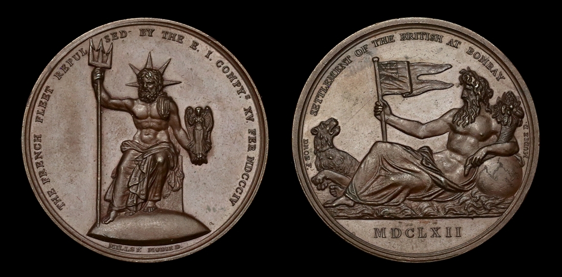 (x) Settlement of the British at Bombay 1662, and the East India Company's Victory over a French Squadron 1804, obverse Neptune holding a Union Jack and cornucopia lying against a globe, surrounded by the legend 'Settlement of the British at Bombay' and 'MDCLXII' in exergue; reverse a seated and crowned Neptune bearing a trident and a figure of Victory, surrounded by the legend 'The French Fleet Repulsed By The E. I. Compys. XV. Feb. MDCCCIV.', BHM 567, Eimer 952, 40mm, copper, 1804, by Droz, Mills and Mudie, good very fine