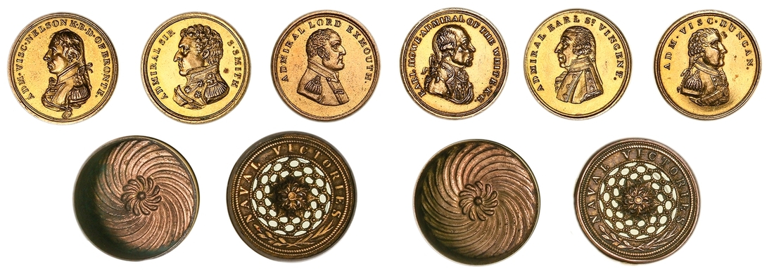 (x) 'Naval Victories', a set of six gilded brass tokens, depicting busts of heroes of the Royal Navy and commemorating their victories on the obverse and reverse respectively, featuring Admiral Viscount Nelson; Admiral Earl St. Vincent; Earl Howe; Admiral of the White; Admiral Viscount Duncan; Admiral Sir Sydney Smith; and Admiral Lord Exmouth, 24mm, contained within their original decorative brass case, circa 1816, a complete set, good very fine (6)