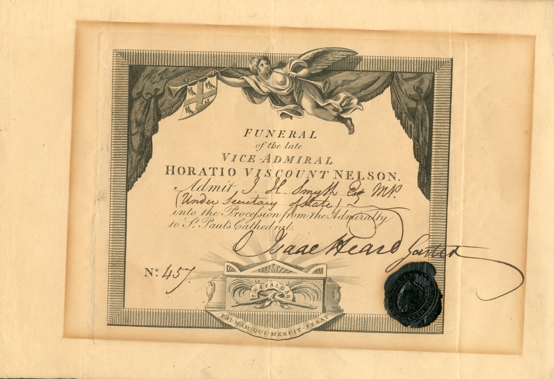 Invitation to the ‘Funeral of the Late Vice Admiral Horatio Viscount Nelson’ issued to J. H. Smyth Esq. M.P., the Under Secretary of State, signed Isaac Heard Garter and No. 457, with black stamp, very fine