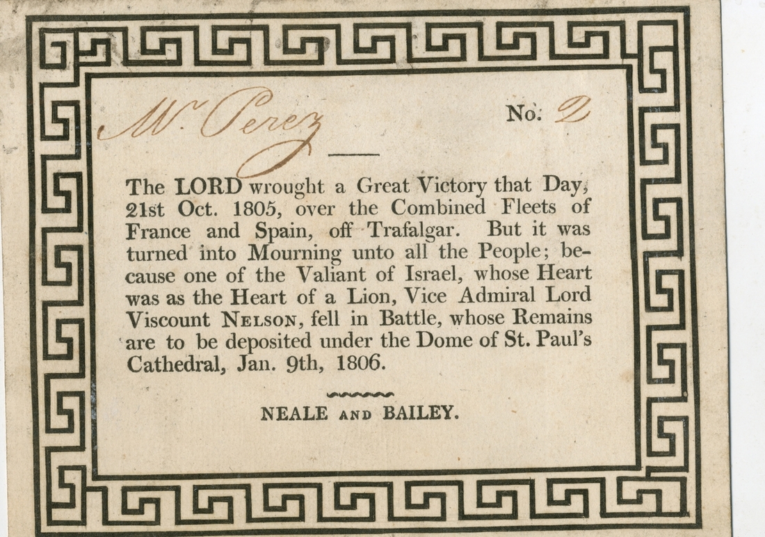 Ticket with Greek key border marked ‘No 2’ addressed ‘Mr Perez’, printed by Neale and Bailey and predating Nelson’s funeral on 9 January 1806, mounted on firm card backing, some stains to upper left corner