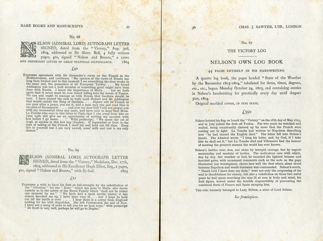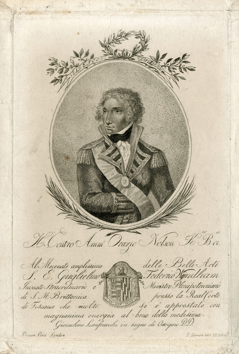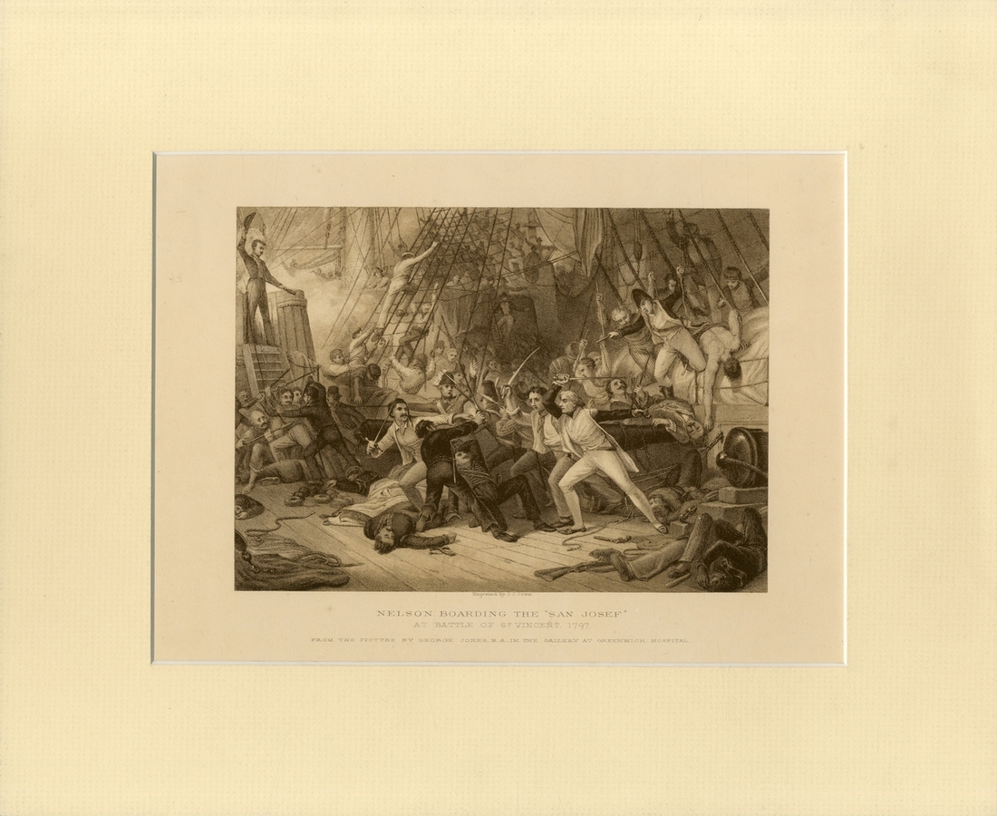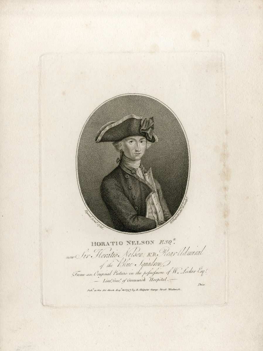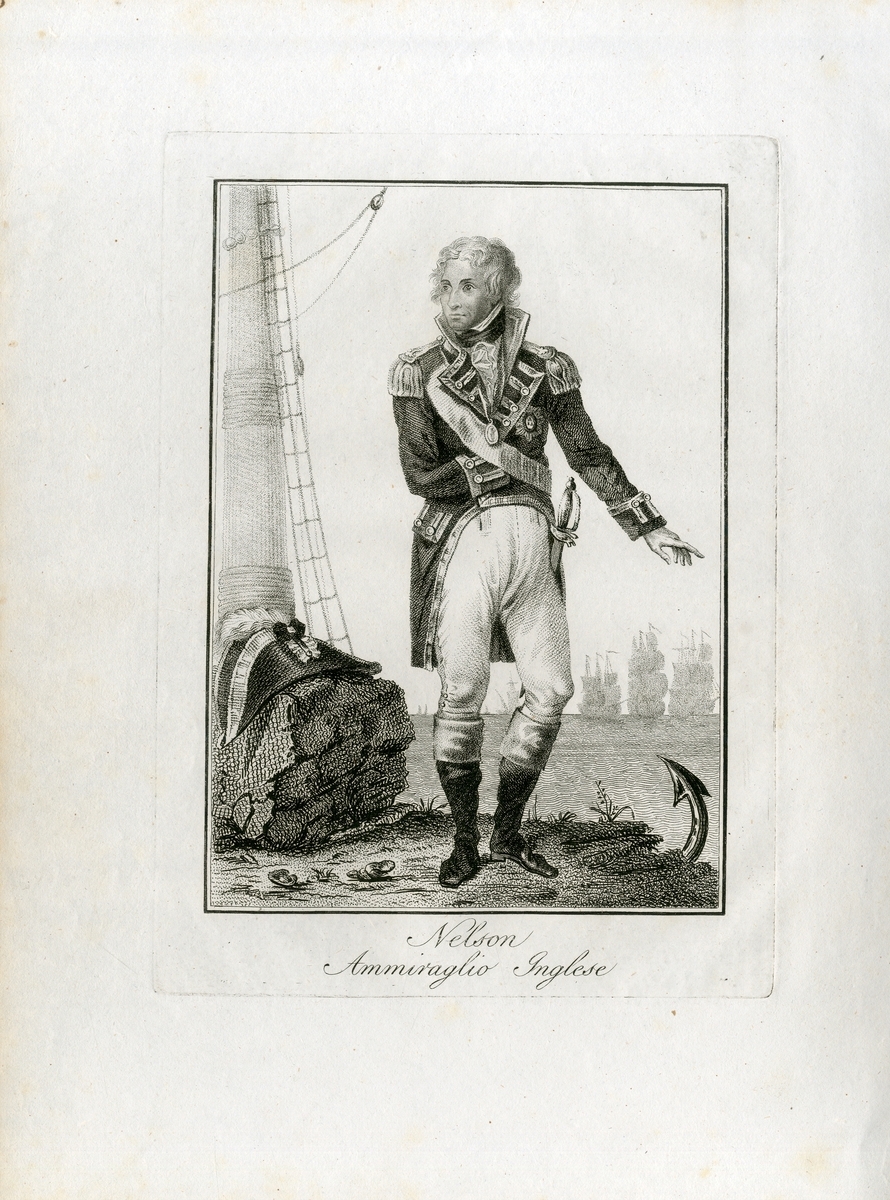 A collection of largely antique portrait prints of Nelson, also including a print of his boarding the San Josef at St. Vincent, some taken from books, two from an Italian publication featuring ‘Ammiraglio Orazio Nelson’, two illustrations commemorating the 250th anniversary of his death, some antique prints reflective of age with foxing and stains, largely in good clean condition overall (14)