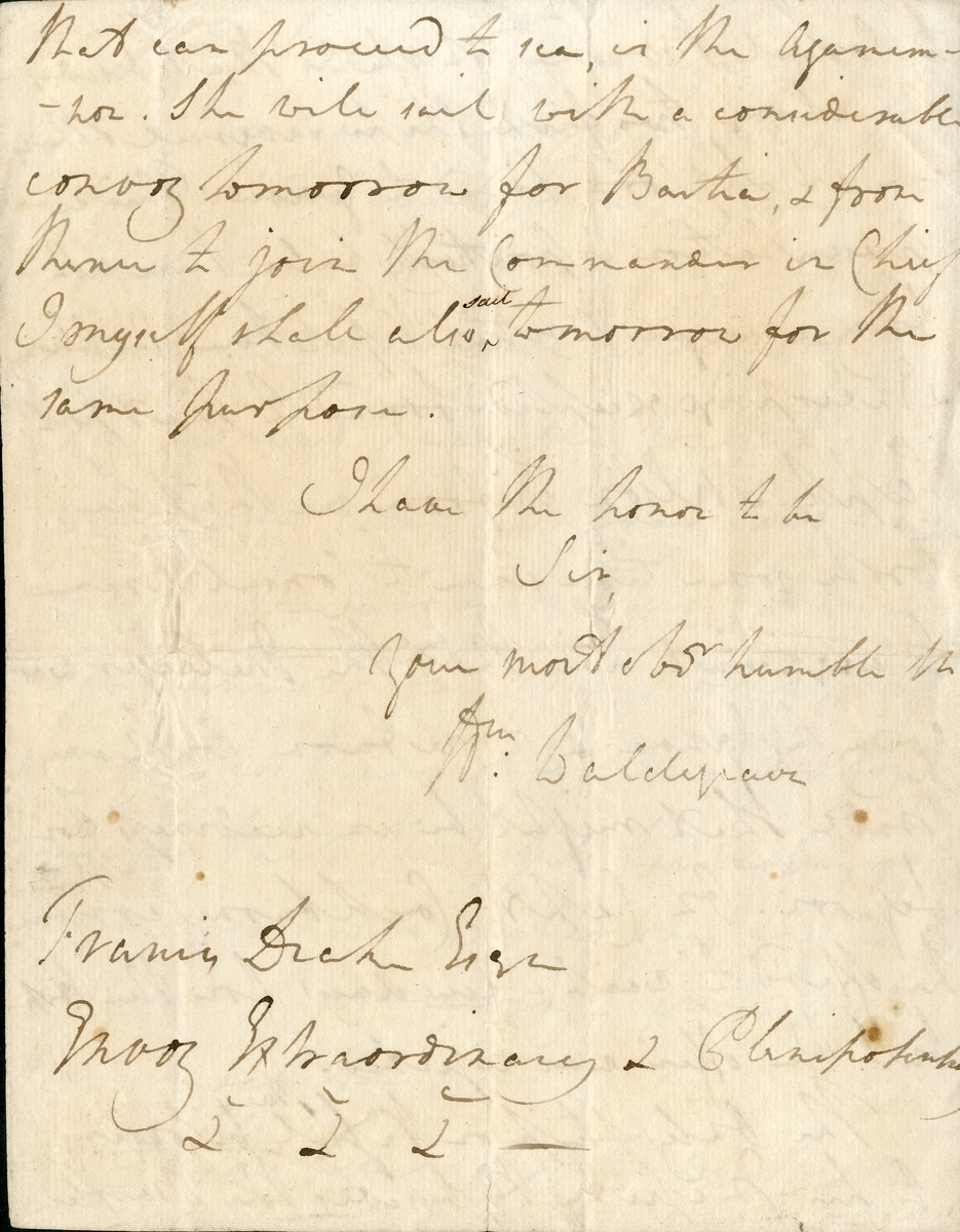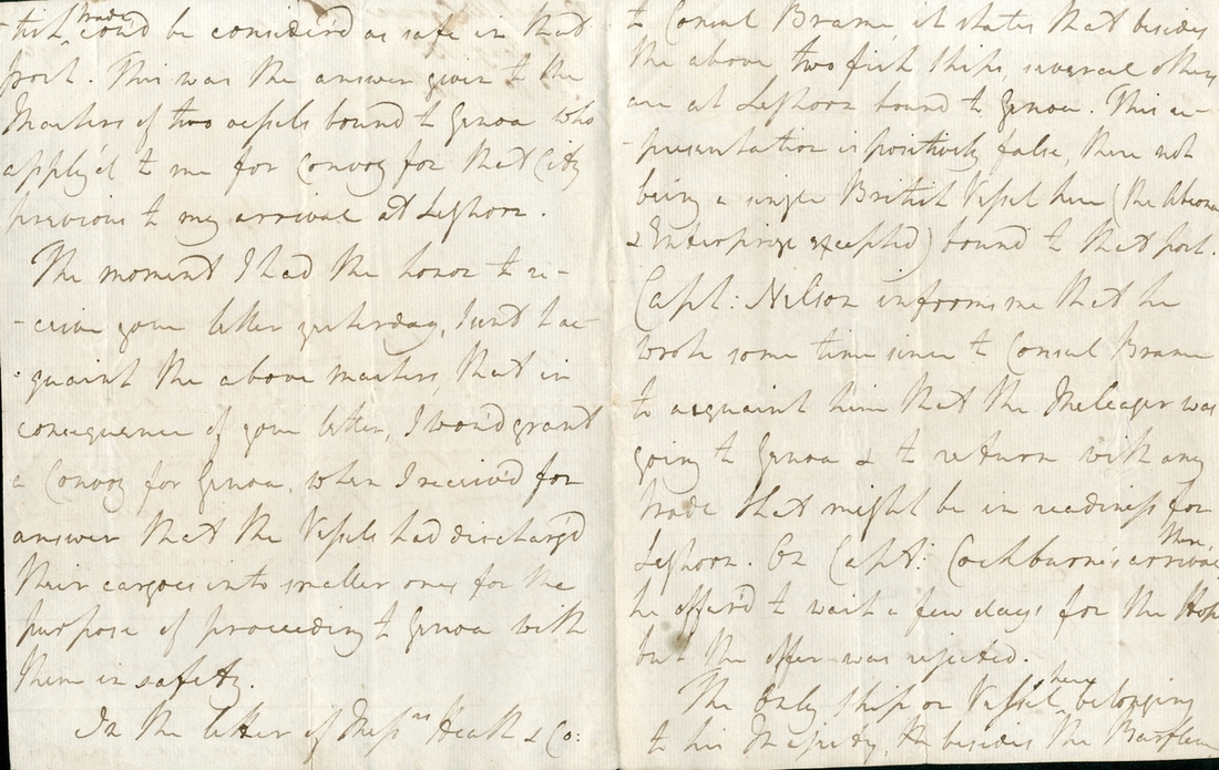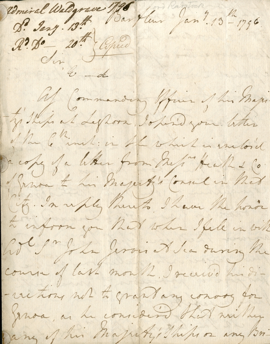 An autograph letter written and signed by Admiral William Waldegrave, addressed to Francis Drake Esq., in which Waldegrave references an earlier conversation he had with Captain Nelson, writing “Capt Nelson informs me that he wrote some time since to Consul Brame(?) to acquaint him that the Meleager was going to Genoa and to return with any trade that might be in readiness for Leghorn”, written aboard H.M.S. Barfleur, dated 13 January 1796, repairs to edge, minor split along fold, foxing, does not obscure text (2)