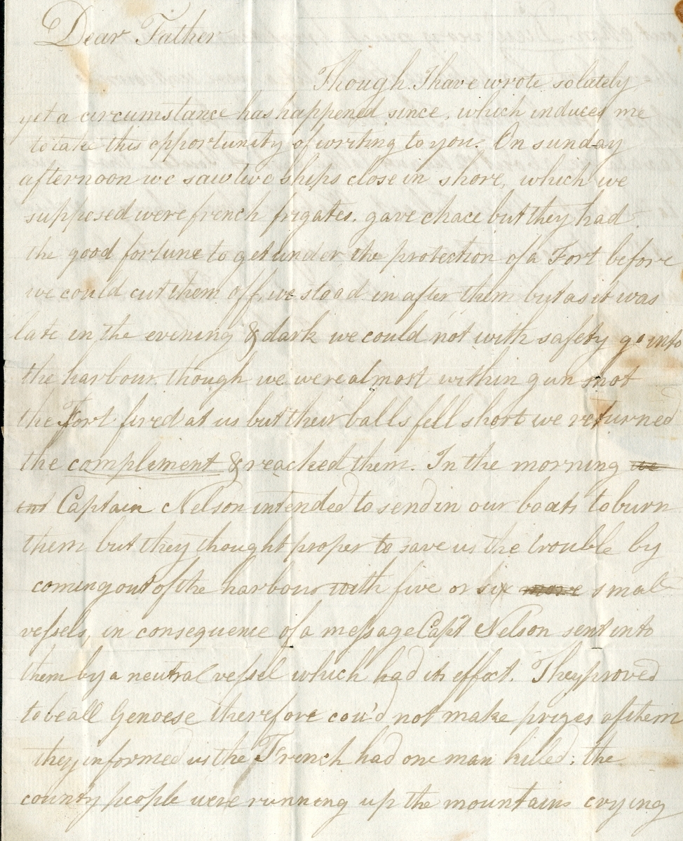 An autograph letter written and signed by a thirteen-year-old William Hoste to his father Reverend Hoste of Godwick Hall, Norfolk, describing a naval engagement in which he was present off the coast of Toulon with reference to Captain Nelson, “In the morning Captain Nelson intended to send in our boats to burn them but they thought proper to save us the trouble by coming out of the harbour with five or six small vessels, in consequence of a message Captain Nelson sent into them…”, reverse dated 1794, folds, foxing and stains, pinholes along folds with paper loss to reverse from seal, despite delicate condition text is clear and legible, this letter would have likely been written aboard H.M.S. Agammenon, on whose books young Hoste’s name appeared from 15 April 1793;