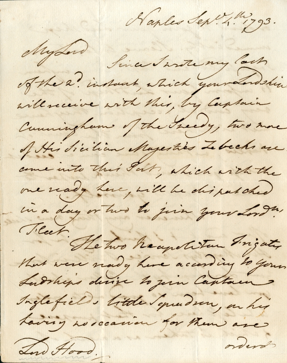 The letter includes a discussion of Hood’s fleet, in which Sir Hamilton notes “two Neapolitan frigates that were ready here according to your Lordships desire to join Captain Inglefield’s little squadron, on his leaving no occasion for them are ordered to join your Lordship immediately”. He further mentions Captains Cunningham and Inglefield and the “very cordial reception they have met with here from the Court of Naples” and discusses the date by which the French Minister will leave the kingdom of Naples, “The French Mnister…is ordered to leave this kingdom before the 8th of this month and all other French, except by particular favor of the Court.”