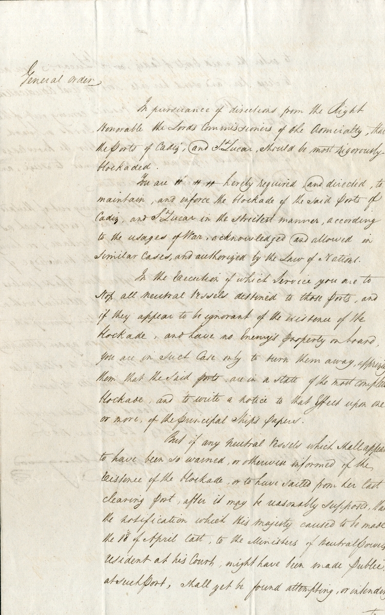 In the order, Collingwood details “”You are hereby required and directed, to maintain, and enforce the blockade of the said ports of Cadiz, and St. Lucar in the strictest manner, according to the usages of War… In the execution of which Service you are to stop all neutral vessels destined to those ports, and if they appear to be ignorant of the existence of the blockade… you are in such case only to turn them away, apprising them that said ports are in a state of the most complete blockade… But if any neutral vessels which shall appear to have been so warned or otherwise informed of the existence of the blockade…attempting to enter the said ports of Cadiz, or St. Lucar, you are to seize her and send her into Port for legal adjudication. And, in respect to vessels coming out of the Ports of Cadiz, or St. Lucar, having Goods onboard which appear to have been laden after the knowledge of the blockade, you are in like manner to seize, and send them in for legal adjudication…”