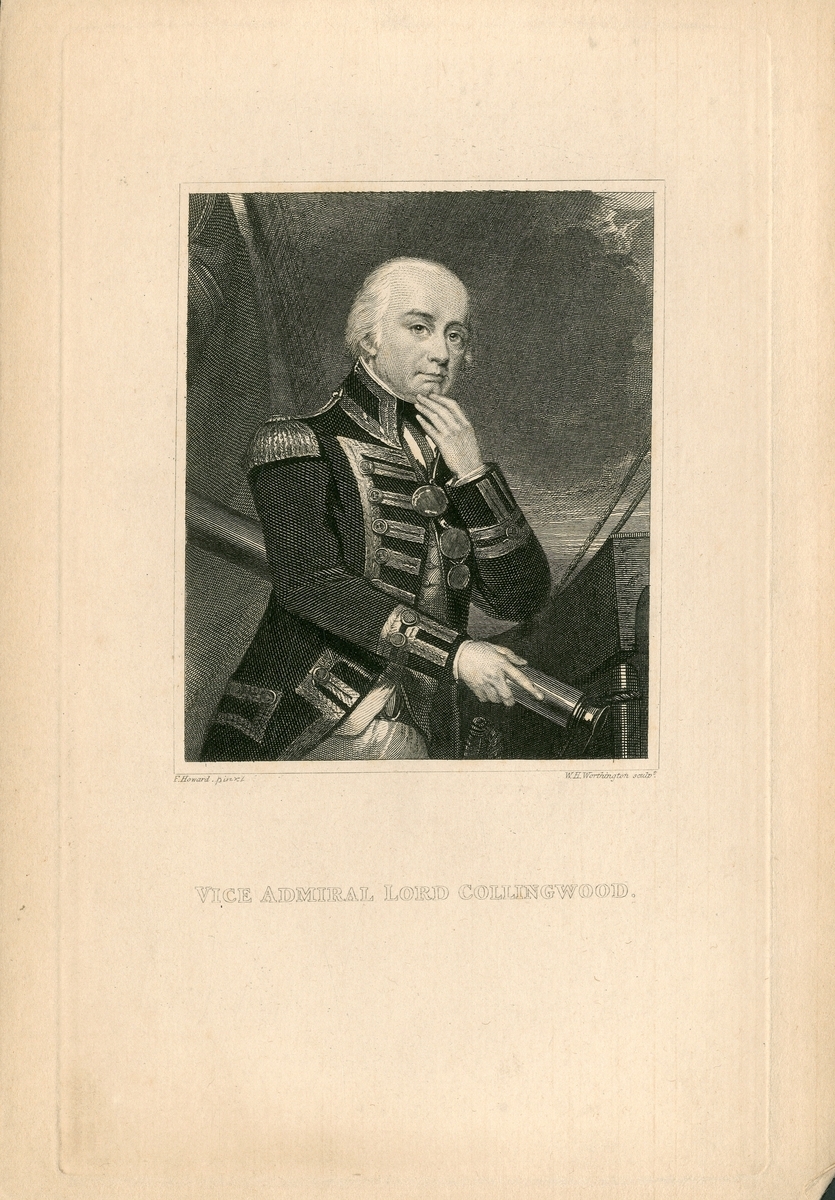 Letter addressed to “The respective Captains and Commanders” ordering the blockade of the ports of Cadiz and St. Lucar, signed by Collingwood on board H.M.S. Dreadnought off Cadiz, dated 23 June 1805; together with a portrait print of Vice Admiral Lord Collingwood; and a 38-page pamphlet by D.F. Stephenson entitled ‘Admiral Collingwood and the Problems of the Naval Blockade After Trafalgar’, published Newcastle 1948, letter features several folds and a small hole to the reverse, otherwise in good condition for its age and text is all clear and legible (3)