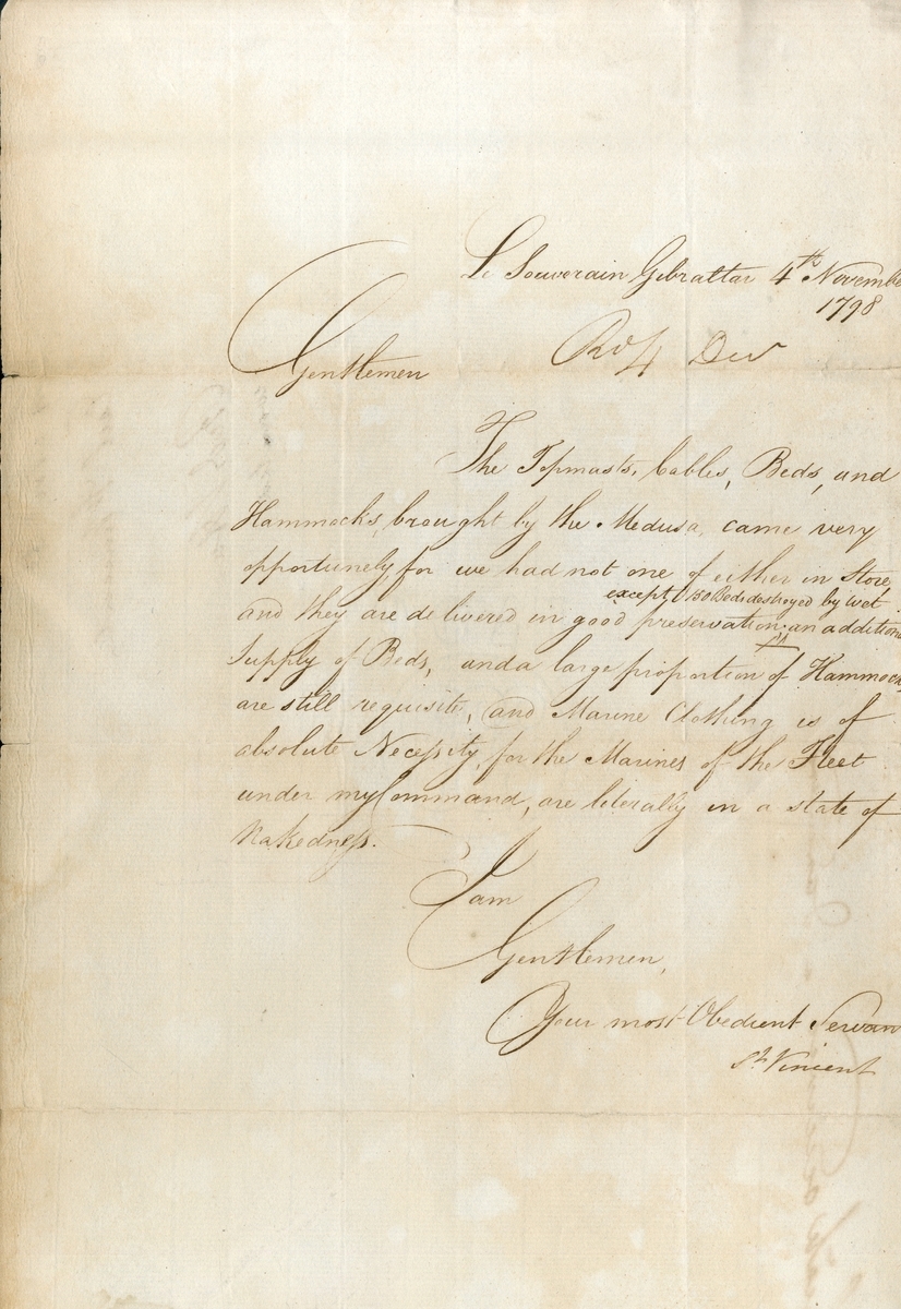 Letter requesting the supply of beds, hammocks and marine clothing for the fleet under his command, signed St. Vincent on board Le Souverain at Gibraltar, dated 4 November 1798, light edge wear and age stains, text clear and legible;