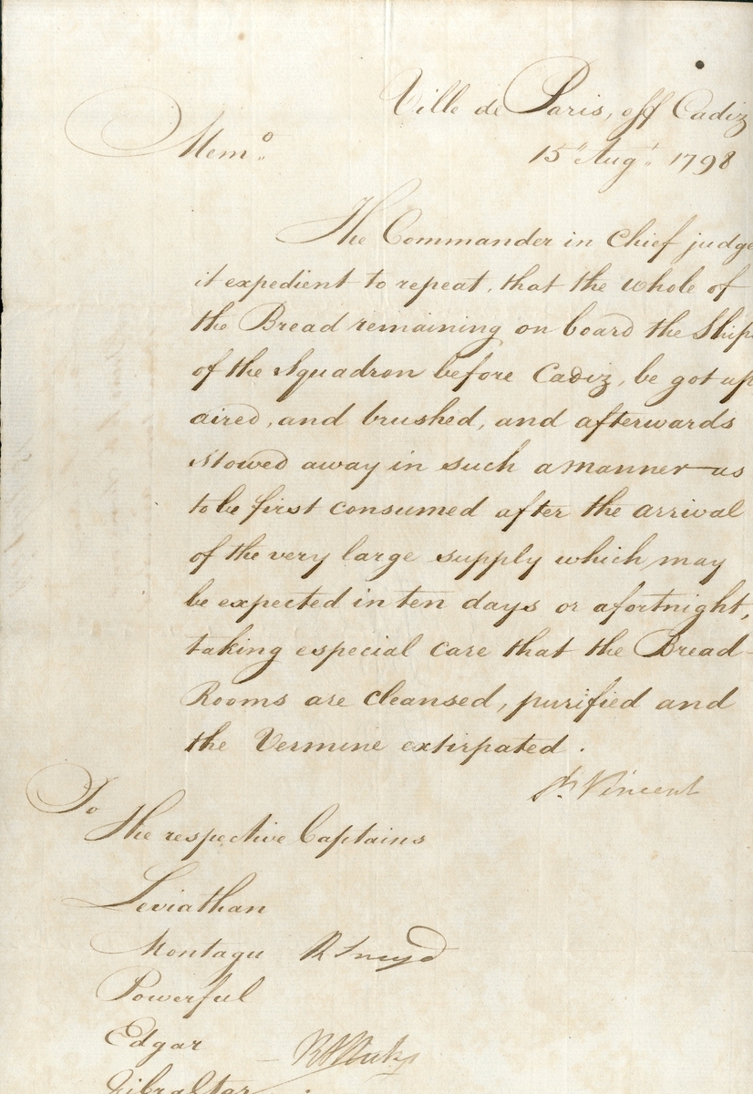 Letter addressed to a number of Captains detailing the proper preservation of bread aboard ships, signed St. Vincent on board Ville de Paris off Cadiz, dated 15 August 1798, light ageing and minor edge wear;
