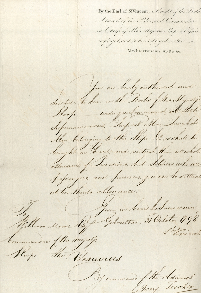 Order for Captain William Moore of Vesuvius to “take under your Command all such Supernumeraries, Imprest Men, Invalids, Men belonging to other ships…”, signed St. Vincent on board Le Souverain at Gibraltar, dated 31 October 1798, a slight margin split and two minor pinholes along reverse folds;