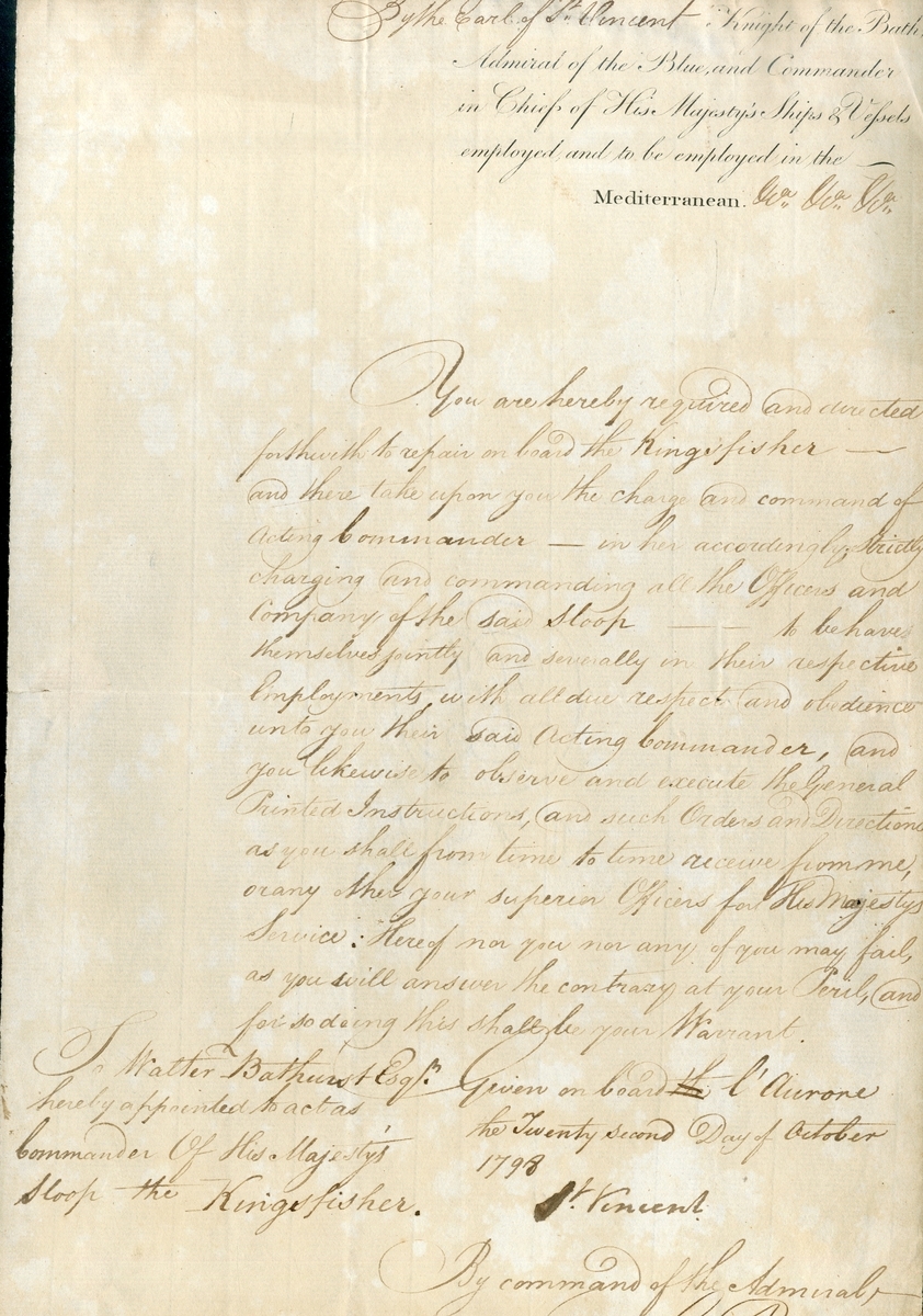 Order for Walther Bathurst Esq. to assume command of H.M.S. Kingfisher, signed St. Vincent on board L’Aurore, dated 22 October 1798, light foxing and ageing;