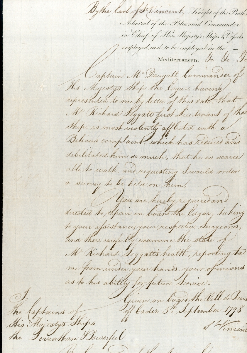 Order for the Captains of Levaithan and Powerful to go aboard Edgar and report on the health of First Lieutenant Richard Leggatt, signed St. Vincent on board Ville de Paris off the coast of Cadiz, dated 5 September 1798, in very fine condition for its age;