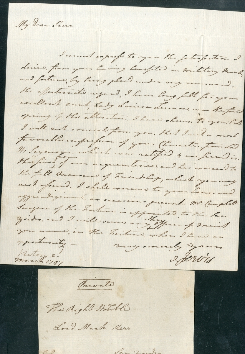 Autograph letter written just a few short weeks after the Battle of St. Vincent to Lord Mark Kerr on board the Spanish prize San Ysidro expressing his satisfaction with Kerr, written and signed by Jervis on board H.M.S. Victory, dated 2 March 1797, a few small pinholes along folds, text is clear and legible;