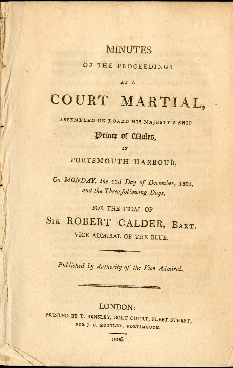 Together with two printed pamphlets ‘Minutes of the Proceedings at a Court Martial, Assembled on board His Majesty’s Ship Prince of Wales, in Portsmouth Harbour, on Monday, the 23rd Day of December, 1805m and the Three following Days, for the trial of Sir Robert Calder, Bart. Vice Admiral of the Blue’, printed by T. Bensley, London, 1806, each in good condition and appear to contain all pages, some light wear to pages and spine damage (9)
