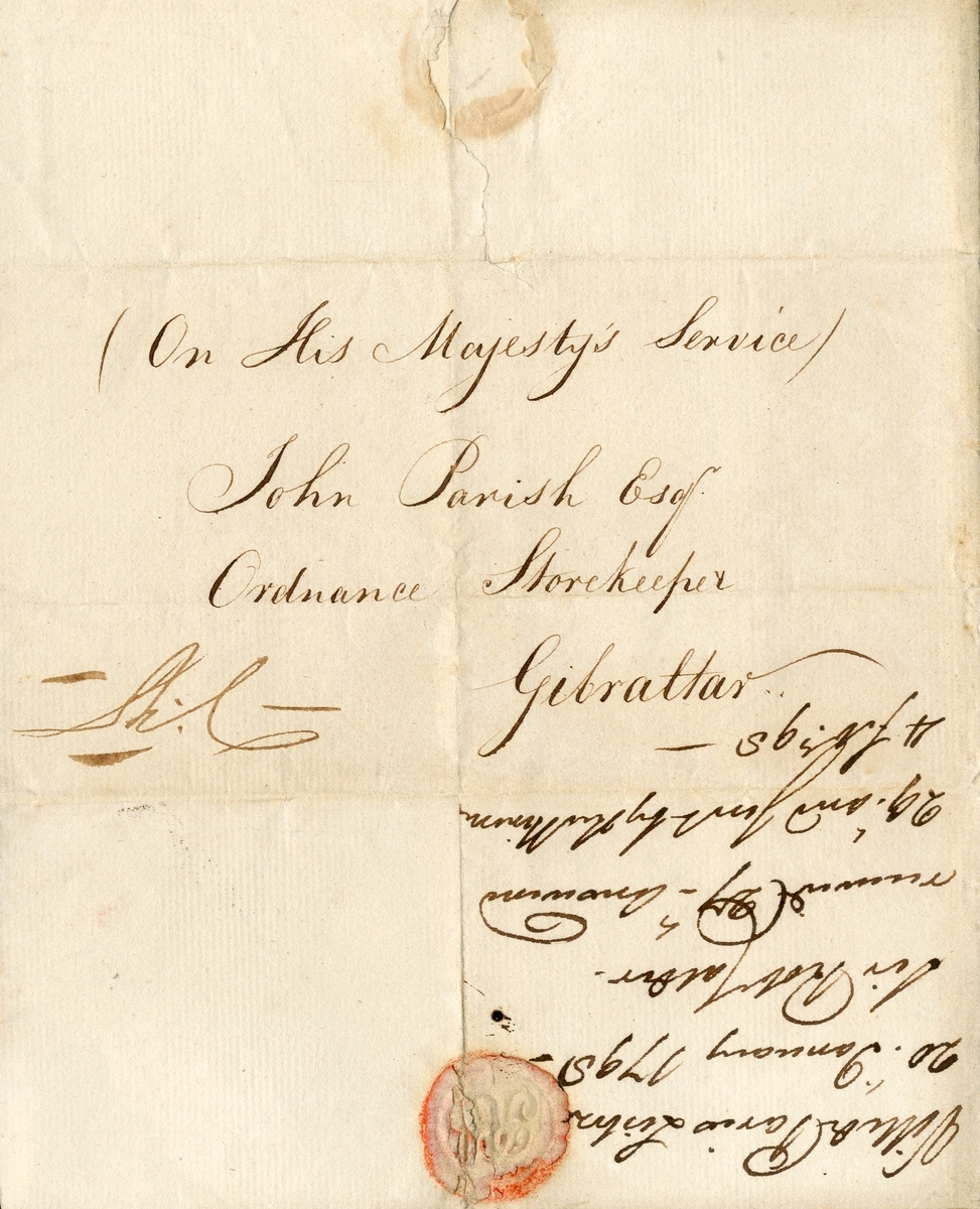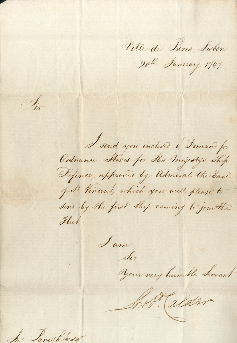 Request for Ordnance stores for H.M.S. Defence, written from H.M.S. Ville de Paris in Lisbon and signed by Calder, dated 20 January 1797, minor paper loss from seal and light stains, otherwise very fine condition;