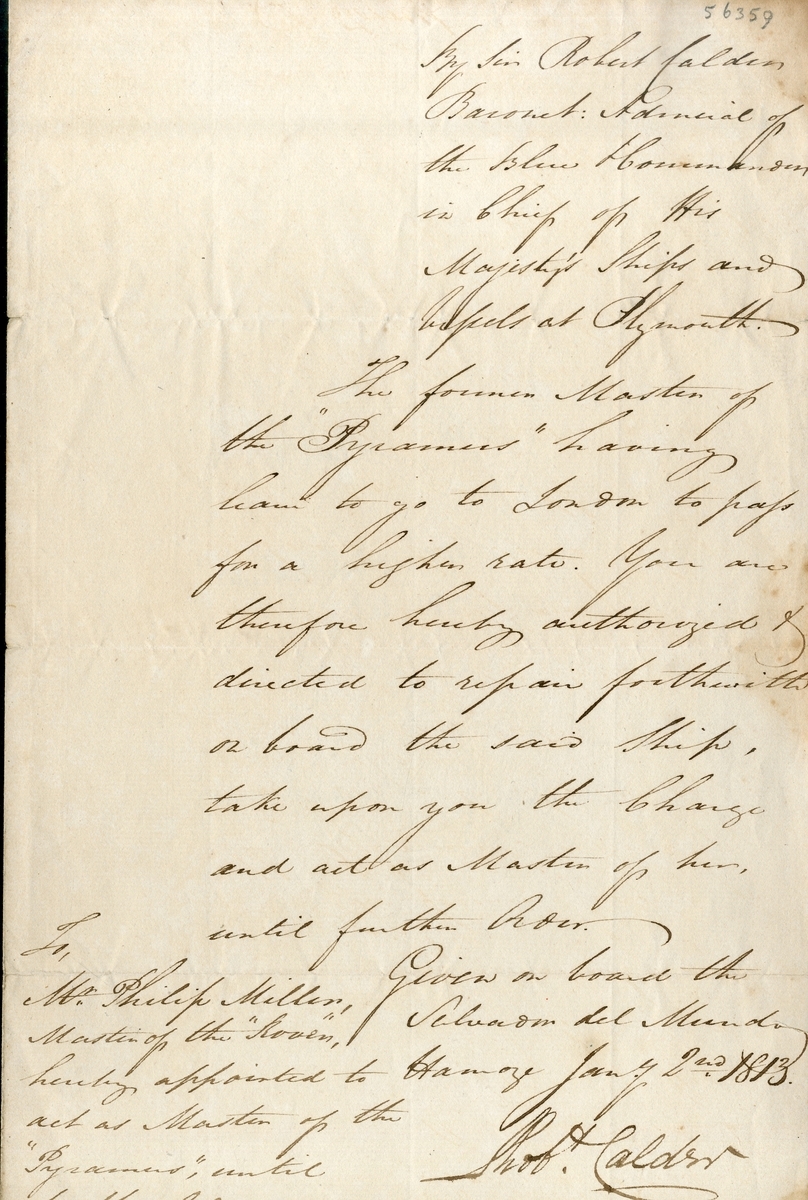 Document appointing Mr. Philip Miller the Master of the Pyramus until further orders, signed by Calder aboard Salvador del Mundo, dated 2 January 1813, light age stains and minor tears, text clear and legible;