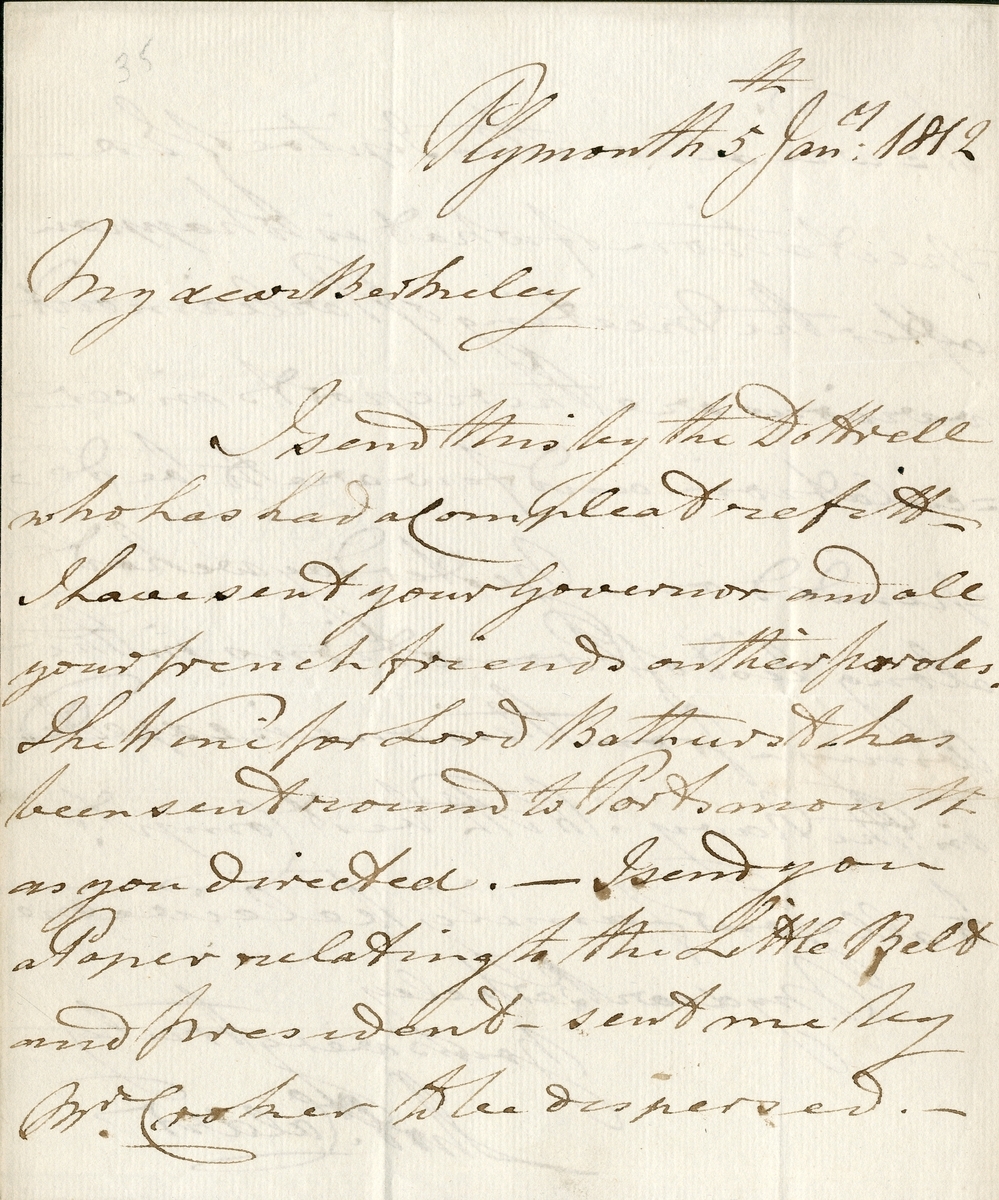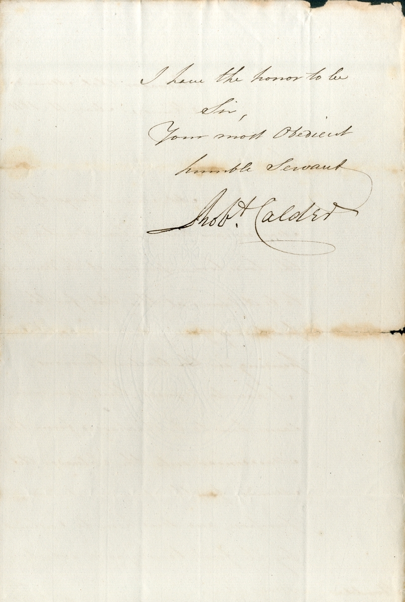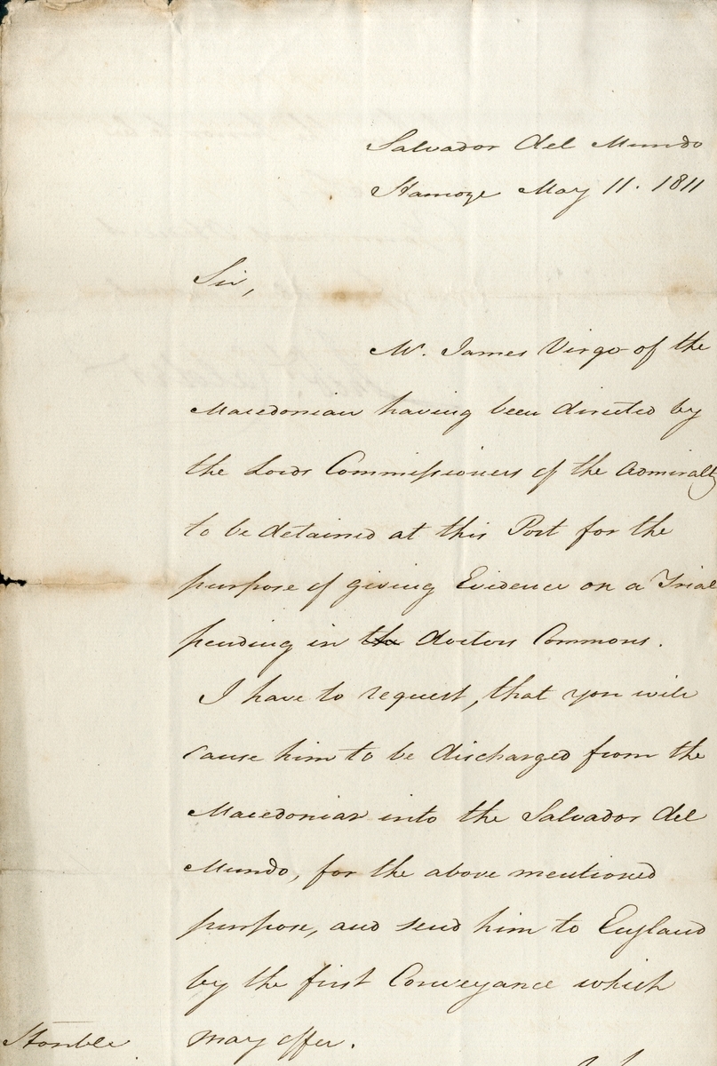 Letter addressed to Admiral Berkely requesting the discharge of James Virgo from H.M.S. Macedonian to Salvador del Mundo to be sent to England to give evidence in a trial, signed by Calder, dated 11 May 1811, some minor paper loss to edge, edge wear and some tears, hole at centre fold, ageing, but text is clear and legible;