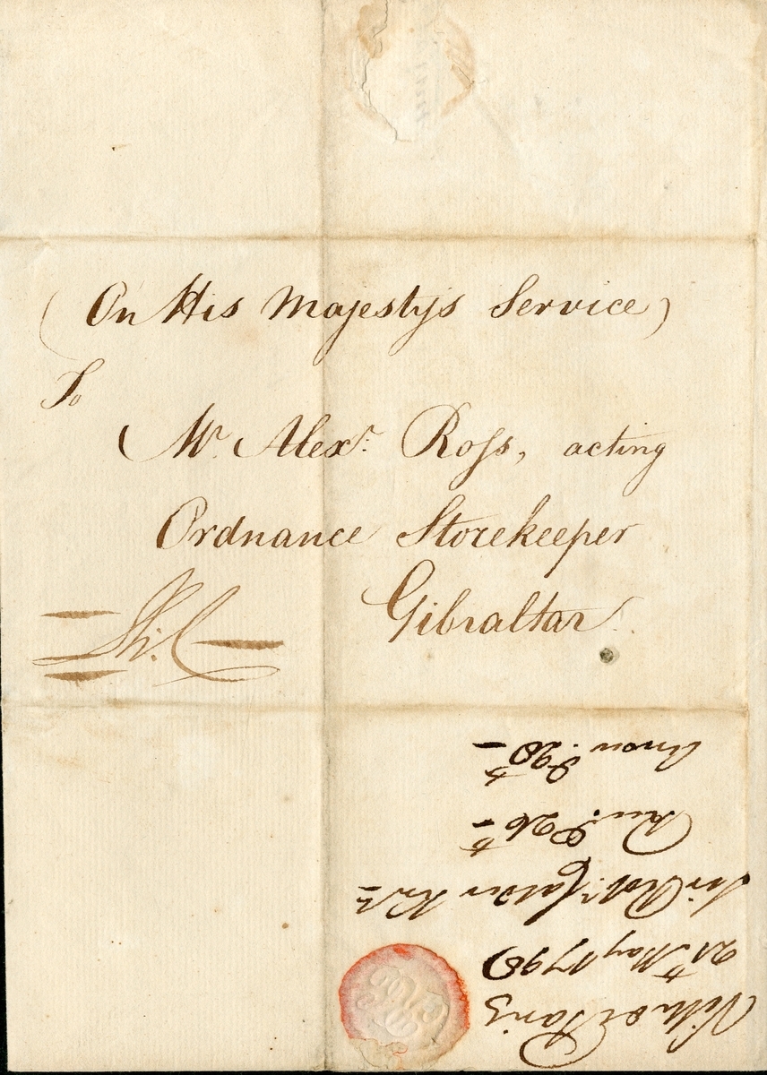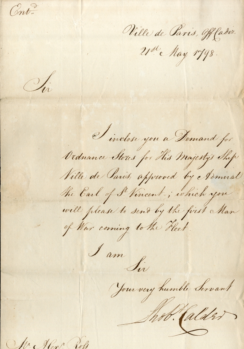 Request for Ordnance stores for H.M.S. Ville de Paris, written aboard that ship off the coast of Cadiz, signed by Calder, dated 21 May 1798, minor paper loss from seal, light ageing stains, otherwise very fine condition;