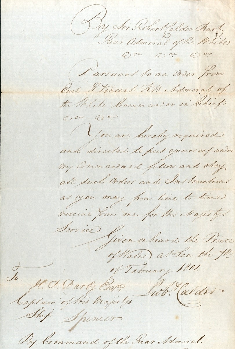 Naval Order for Captain Spencer of H.M.S. Spencer to place himself under Calder’s command, written aboard H.M.S. Prince of Wales and signed by Rear Admiral Sir Robert Calder, dated 7 February 1801, folds and minor ageing, clear and legible;