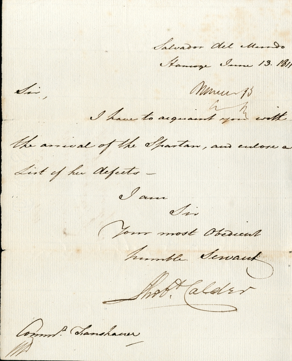 Letter to Commissioner Fanshaw noting enclosed list of Spartan’s defects [list not included], signed aboard Salvador del Mundo by Calder, dated 13 June 1811, minor edge tears and light ageing;