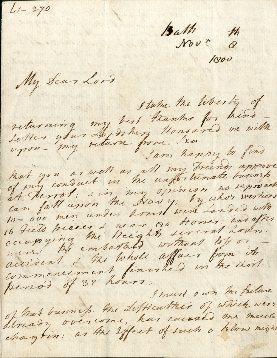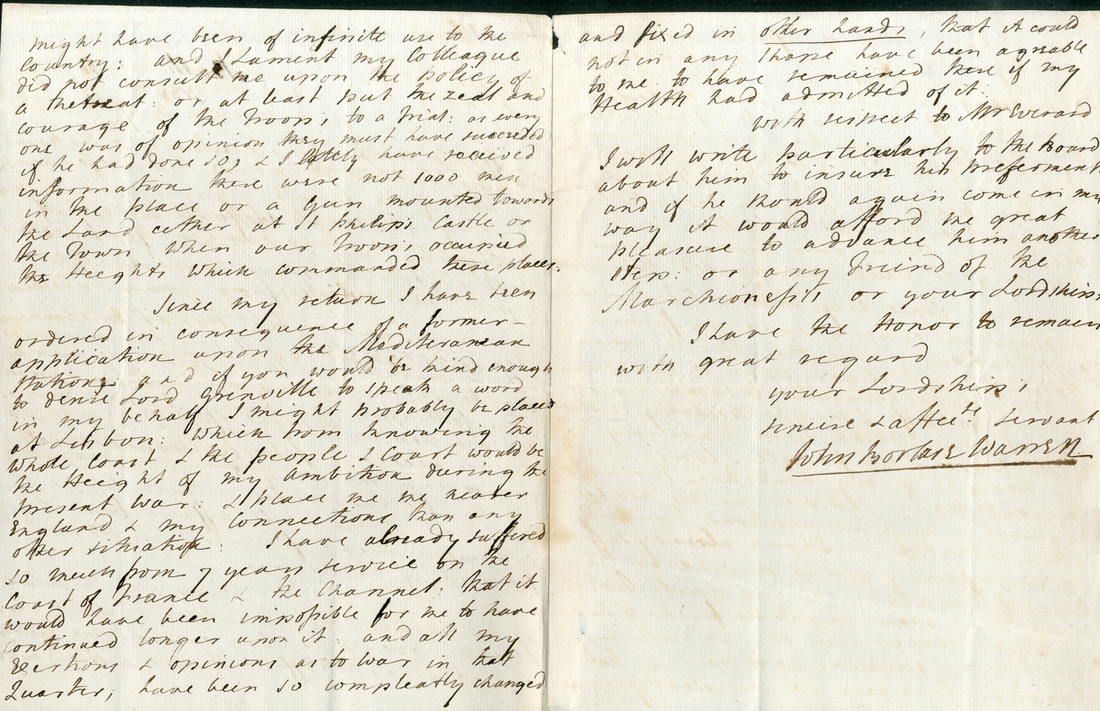 An autograph letter to an unknown recipient, ‘Your Lordship’, in which Warren laments the unfortunate situation at Ferrol in which he was unable to carry out his orders, writing “I must own the failure of that business, the difficulties of which were already overcome, has caused me much chagrin: as the effect of such a blow might have been of infinite use to the Country…”, the letter written and signed by Warren from Bath, dated 8 November 1800;