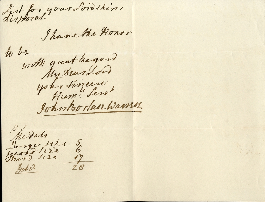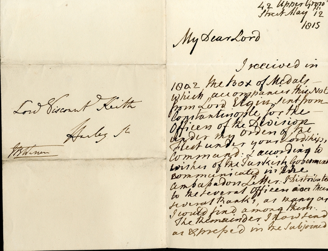 An autograph letter addressed to Admiral Lord Keith, sending him a box of medals originally sent to him from Lord Elgin in Constantinople “for the Officers of the Division under my Orders of the Fleet under your Lordship's command…”, written and signed by Warren from 42 Upper Grosvenor Street in London, dated 12 May 1815 (Lot)