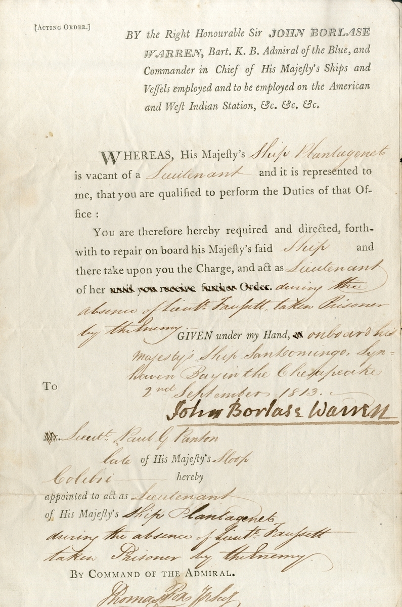 A Royal Navy appointment document issued to Paul G. Panton to perform the duties of Lieutenant aboard H.M.S. Plantagenet “during the absence of Lieut. Faussett, taken prisoner by the Enemy”, signed on board by Warren whilst off shore of Chesapeake Bay during the War of 1812, dated 2 September 1813;