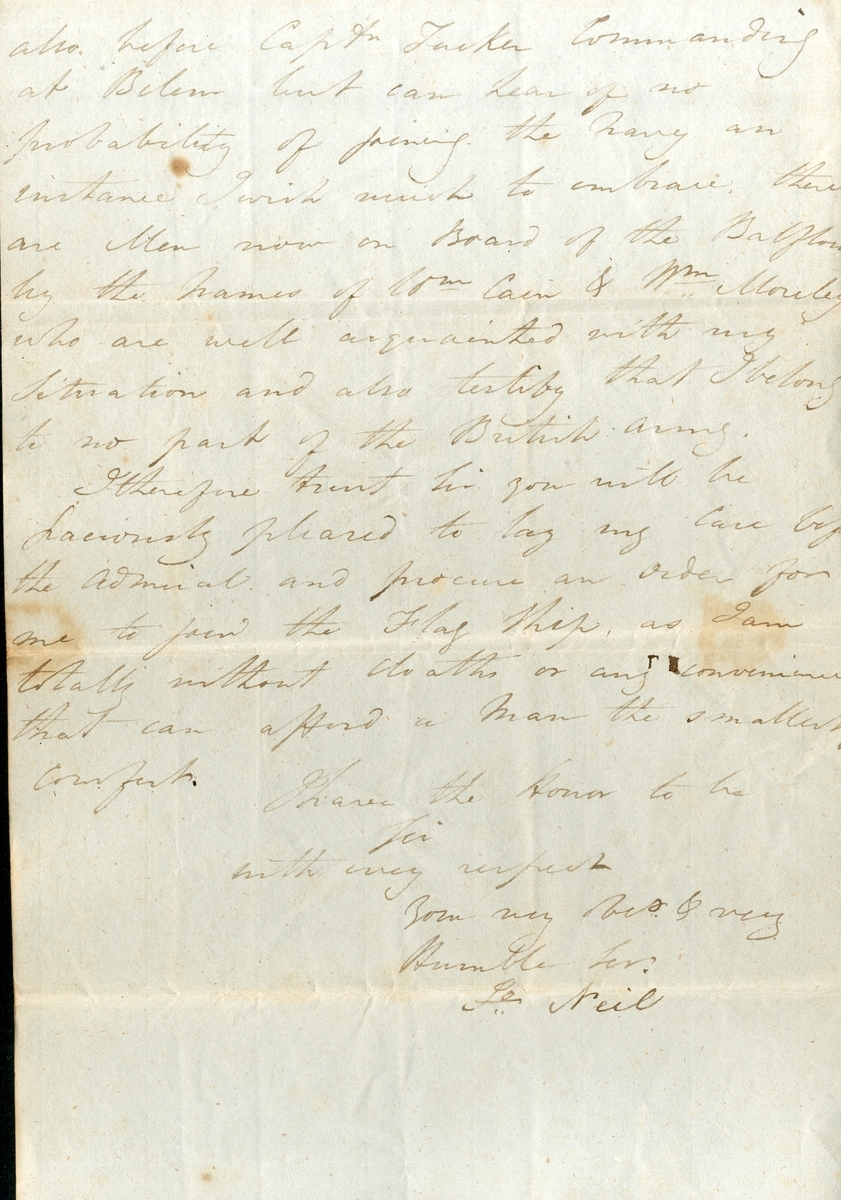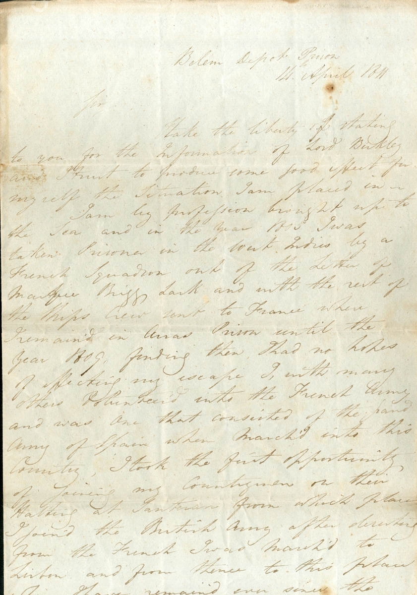 Letter addressed to Captain Thomas Hardy aboard H.M.S. Barfleur from J. Neil, a British seaman who deserted the French Army in Spain and was imprisoned at the Belem Depot prison, arguing for his release and asking to join Hardy’s crew, some aging and stains, minor edge wear, otherwise in good condition with clear and legible text;