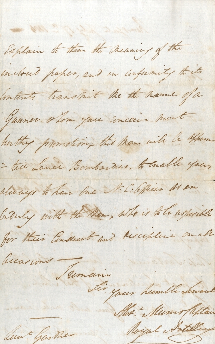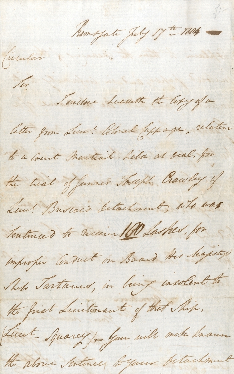 Autograph letter relating to a Court Martial for the trial of Gunner Joseph Crawly, “who was sentenced to receive 100 lashes for improper conduct on Board His Majesty’s Ship Tartarus”, sent by a Captain of the Royal Artillery, dated 17 July 1804, ageing and minor edge wear, otherwise very fine condition;