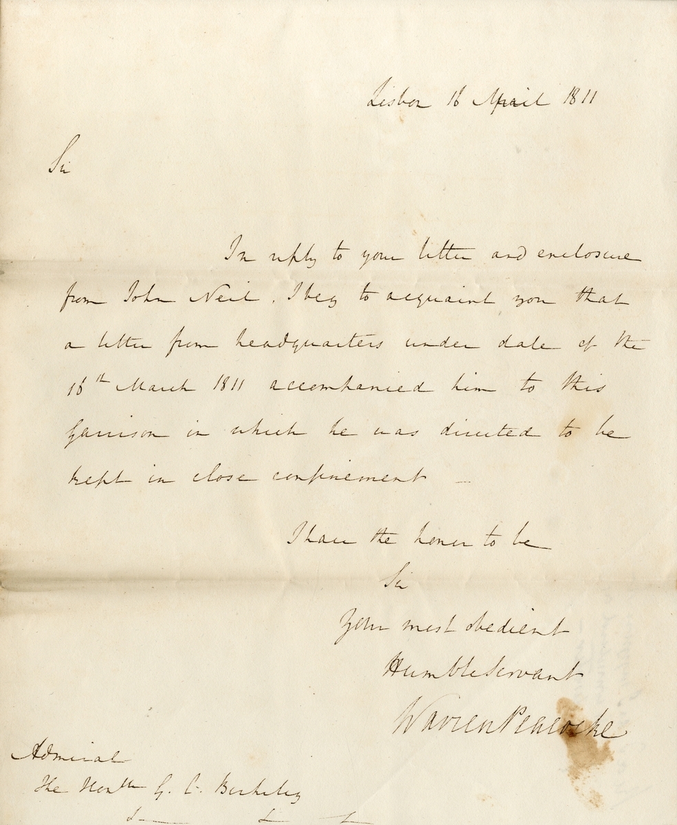 Together with a letter from Colonel Warren Peacocke to Admiral Berkely referring to Neil’s imprisonment, dated 16 April 1811, pinholes along folds, contemporary stains, in otherwise good condition (6)