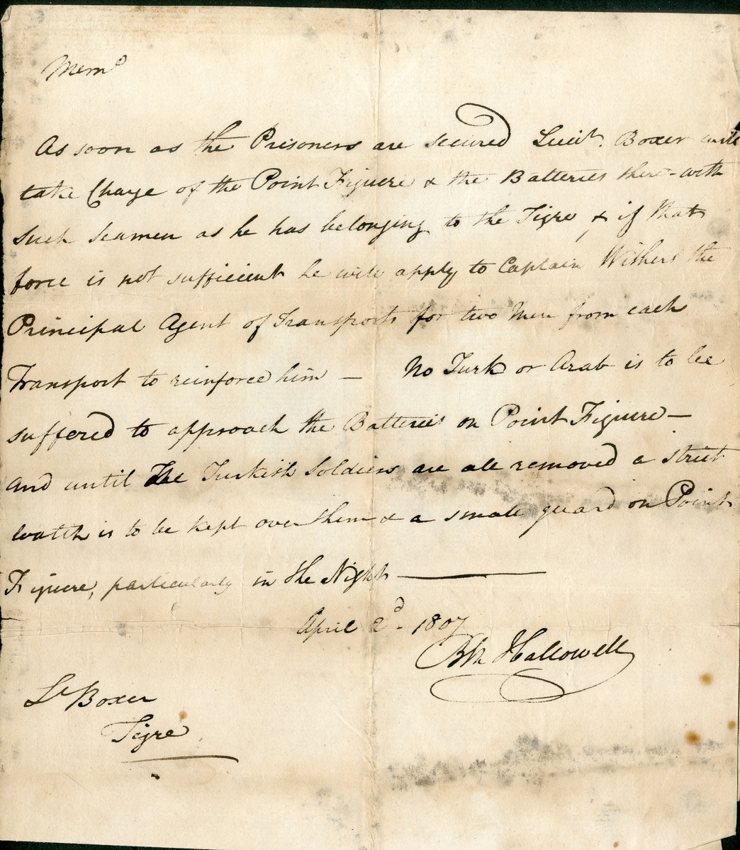 Memo signed by Benjamin Hallowell addressed to Lieutenant Boxer aboard H.M.S. Tigre discussing prisoners and Turkish soldiers, dated 2 April 1807, pinholes along folds, minor paper loss, foxing, edge wear and tear, otherwise text is legible;