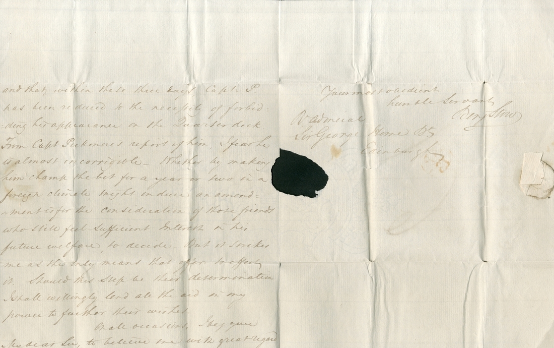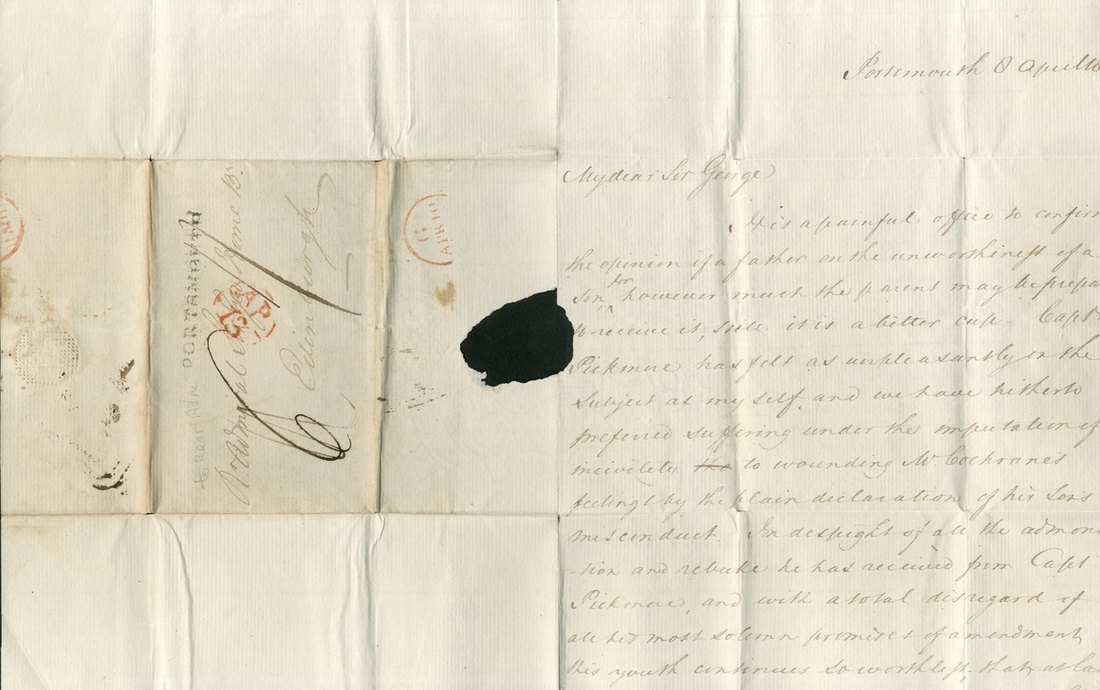 Autograph letter addressed to Rear Admiral Sir George Home, which bemoans the conduct of the son of W. Cochrane, noting “From Capt. Pickenare[?]’s report of him, I fear he is almost incorrigible - whether by making him champ the bit for a year or two in a foreign climate might induce an amend…”, sent from Portsmouth, dated 8 April 1801, paper loss from seal, minor pinholes at folds, does not obscure text;