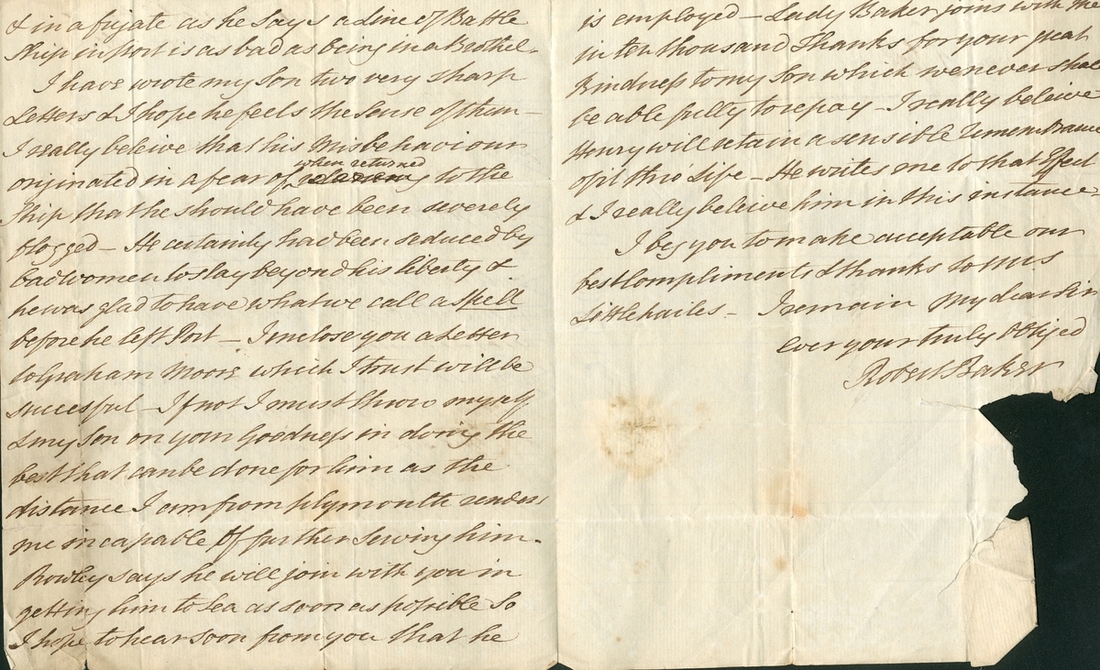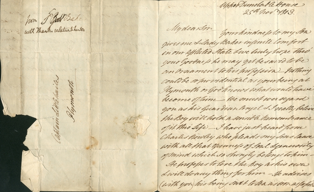 Autograph letter addressed to Captain Littlehales, Plymouth, discussing his sons misbehaviour in the Navy, remarking “I really believe that his misbehaviour originated in a fear of when returned to the ship that he should have been severely flogged…”, written and signed by Sir Robert Baker at Upper Dunstable House, dated 25 November 1803, creasing and some edge tears, significant paper loss to reverse to final page, but all text clear and legible;