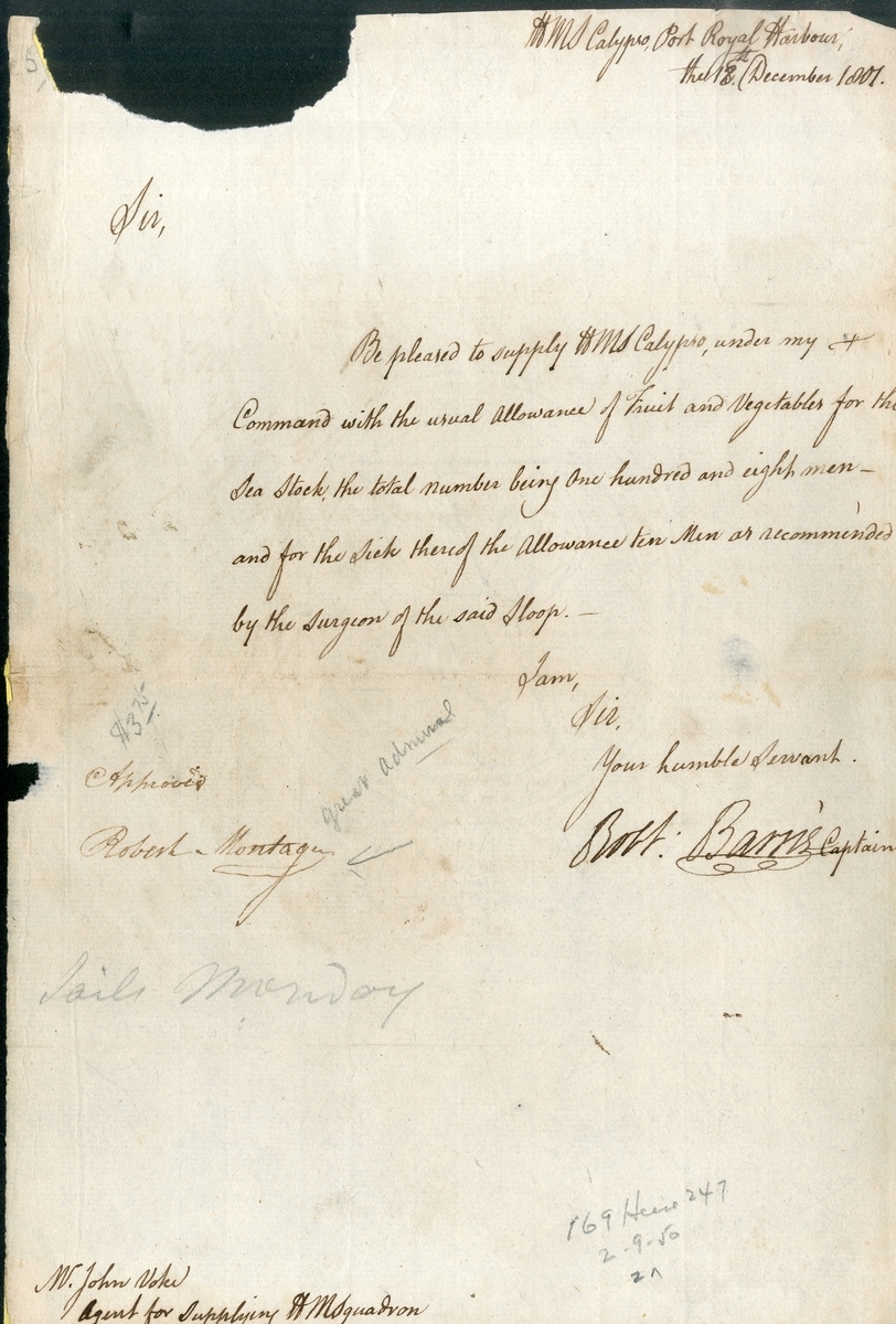 Order requesting fruit and vegetables for the sea stick of H.M.S. Calypso, with108 men on board, ten of whom are sick, signed on board by Captain Robert Barris, dated 18 December 1801, some ageing and paper loss, reverse partially repaired with paper, does not obscure text (7)
