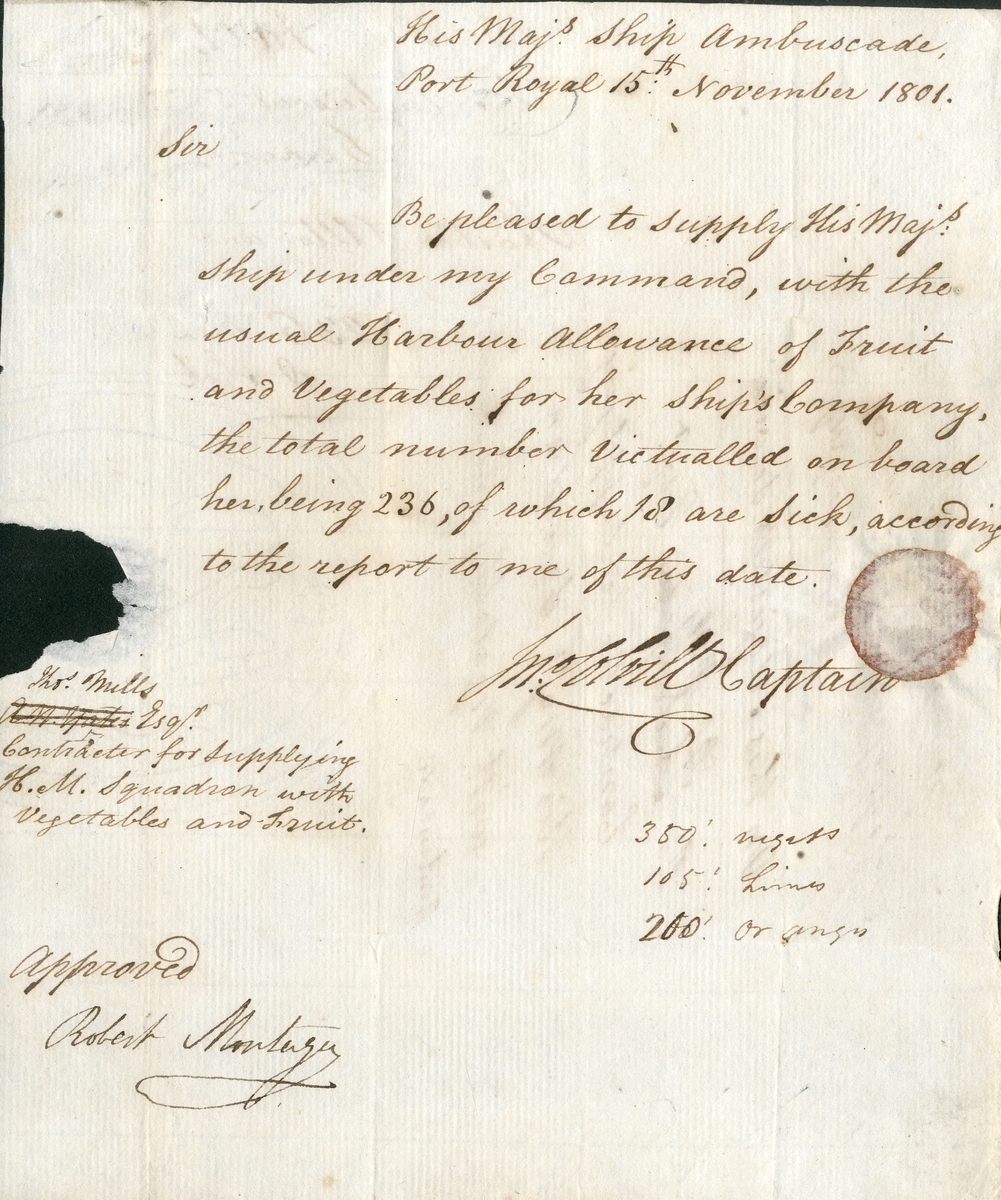 Order requesting fruit and vegetables for the company of H.M.S. Ambuscade, having on board 236 men “of which 18 are sick”, signed on board by Captain John Colvill, dated 15 November 1801, and further detailed “approved” and signed by Richard Montagu, Commander-in-Chief of the Jamaica Station, minor edge wear and paper loss to left margin, does not obscure text;