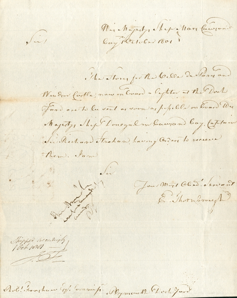 An order to Commissioner Fanshaw for stores to be sent to H.M.S. Donegal, signed by Rear Admiral Edward Thornbrough aboard H.M.S. Mars in Cawsand Bay, dated 1 October 1801, minor margin tear, light folds and ageing, does not interfere with text;